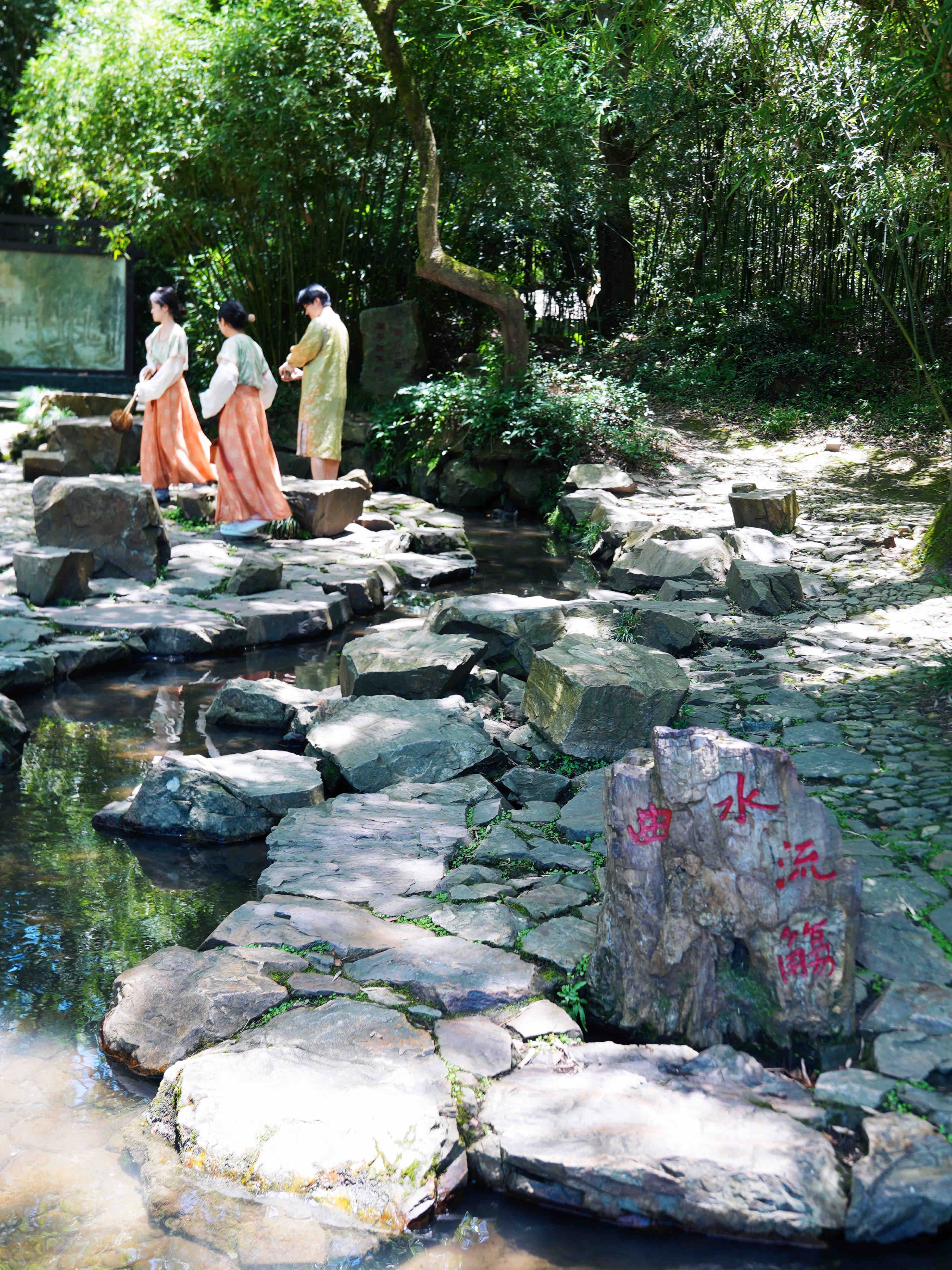 一入景区,喧嚣骤然被层层叠叠的翠竹滤净,我站在鹅池畔,看大白鹅悠然划开绿绸般的水面。在曲水流觞处驻足,仿佛千年之前那场醉倒历史的文人雅集余韵未绝。