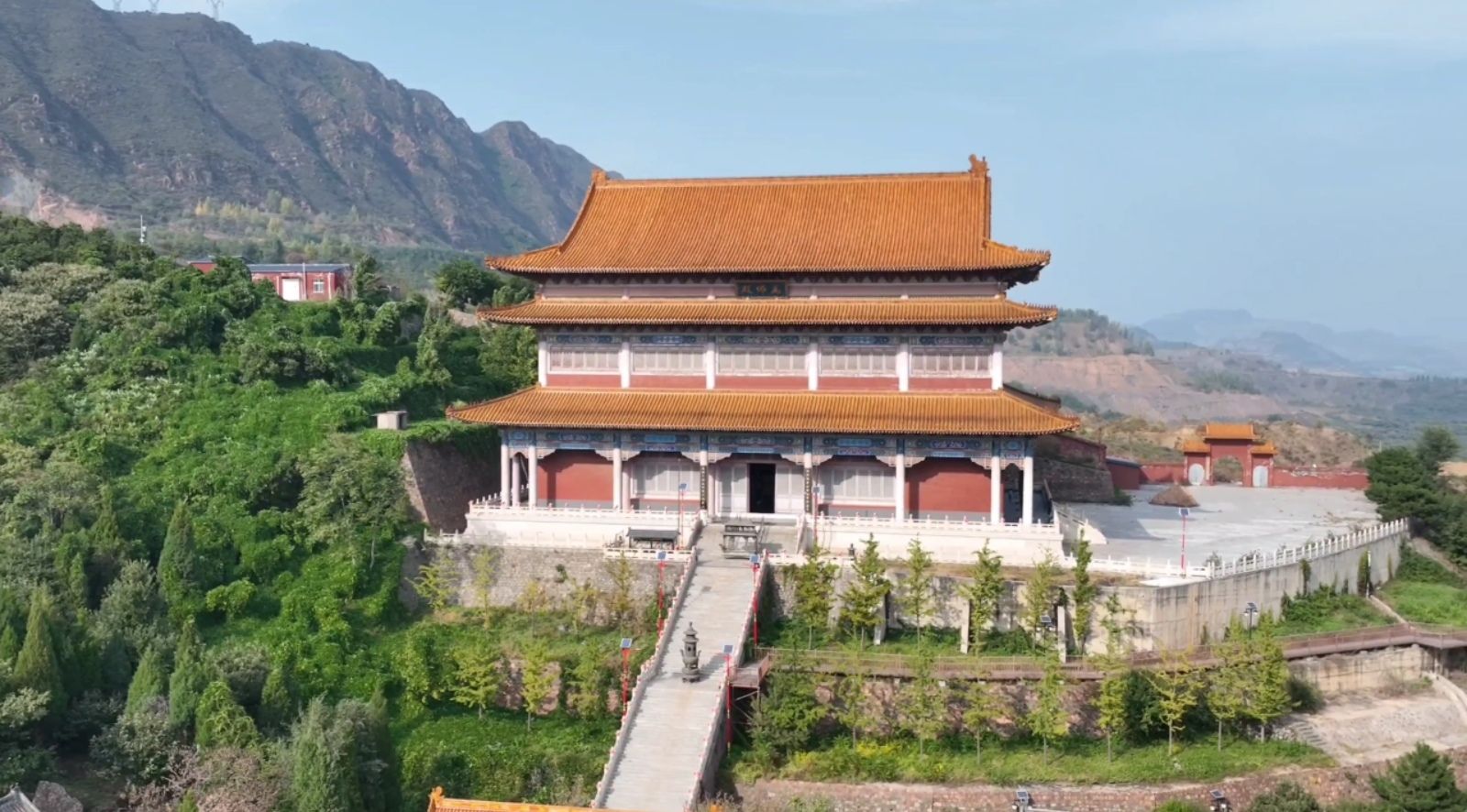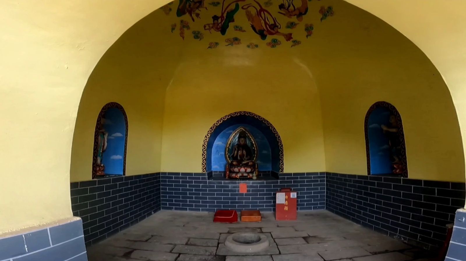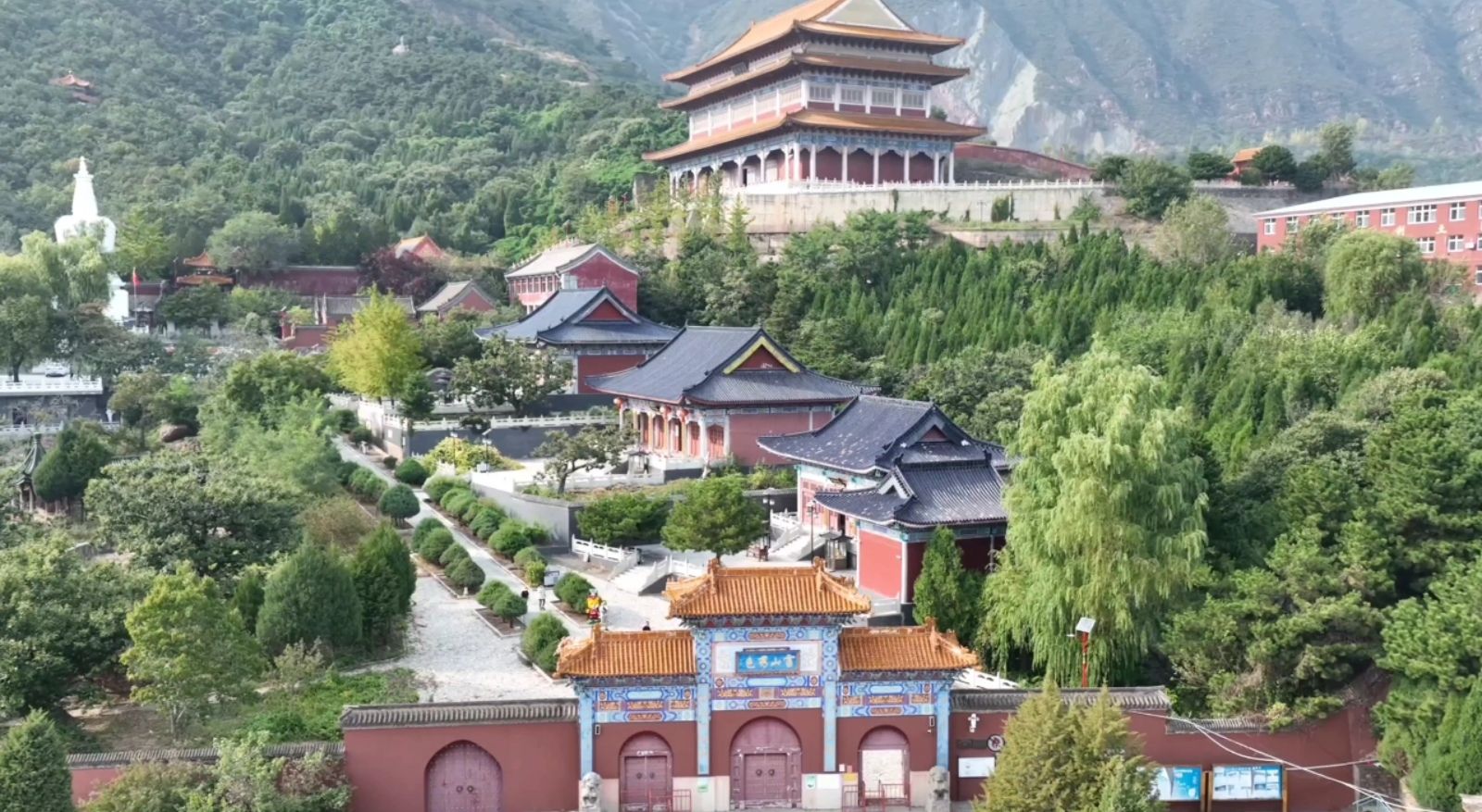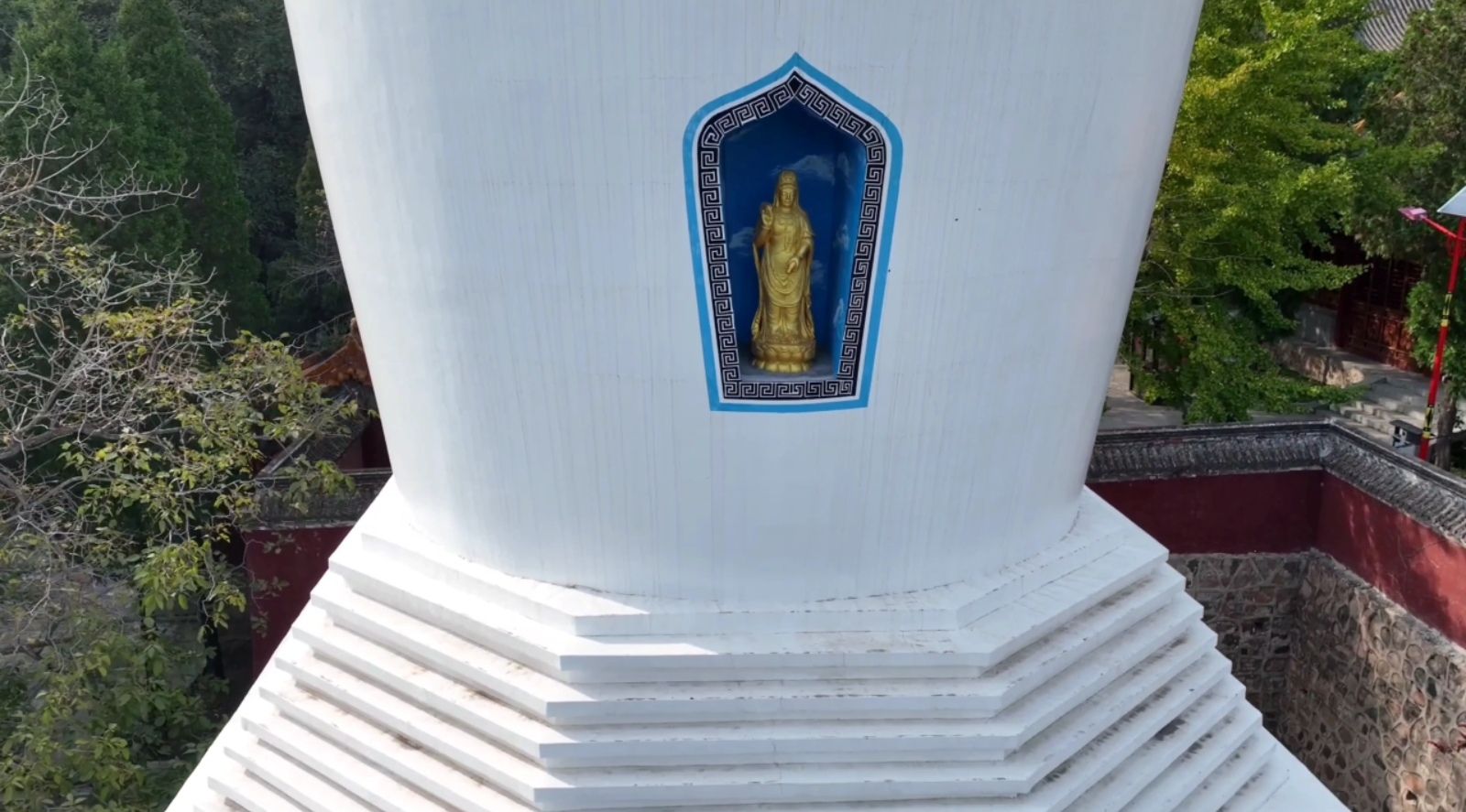 空中俯瞰,灵山寺白塔还有几分特质。宝塔为覆钵式,通体用砖石砌筑,共分塔基塔身和塔刹,高约二十八米。塔基用大理石砌成一个浅束腰的须弥座,塔基用砖砌成一个高约九米边长约六米的四方体基座,塔内有塔心室,室内中间有一眼泉水,这就是灵山寺的圣泉,里面四壁还有女娲补天的彩画。