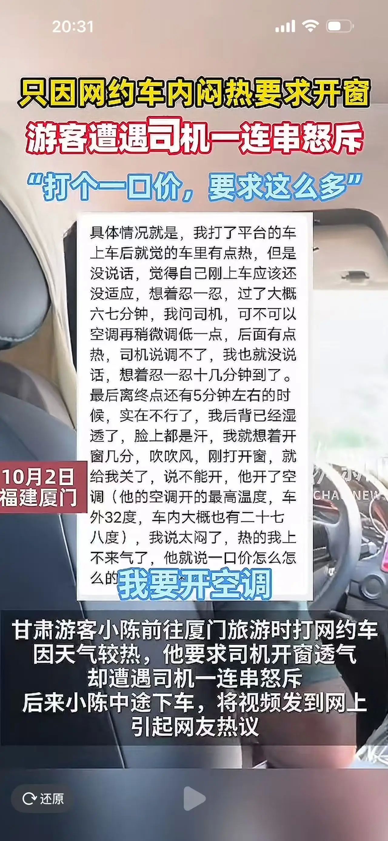 在炎热的夏日里,出行本就够难受,尤其是在高温炙烤下的城市街头。一位甘肃游客前往厦门旅游,为了避暑,果断要求司机开窗透气,毕竟在闷热的车厢里,谁都希望能多一点清凉。可是,令人难以理解的事情发生了——司机不仅没有理解,反而怒斥:“打个一口价,要求还这么多!”这句话瞬间点燃了网友们的情绪,也引发了关于城市文明、旅游体验以及尊重基本人性的热烈讨论。