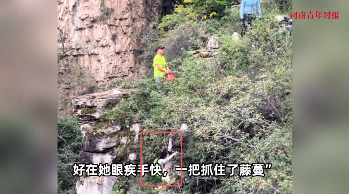 此刻她正死死的抓住藤蔓,周围的游客没有结实的绳子,但是又担心消防救援赶来时已经为时已晚,女子没有力气了或者藤蔓断了,都可能导致悲剧发生。