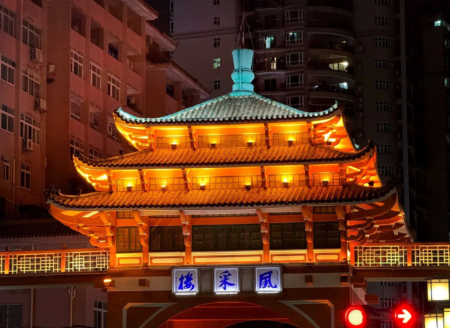 晚上我们吃完饭,到了韶关市区,风采楼坐落在韶关的闹市,东临浈江,西望武水,气势轩昂,建筑精巧,古色古香,被誉为韶关的标记。晚上在彩灯的装饰下更能显其“风彩”。