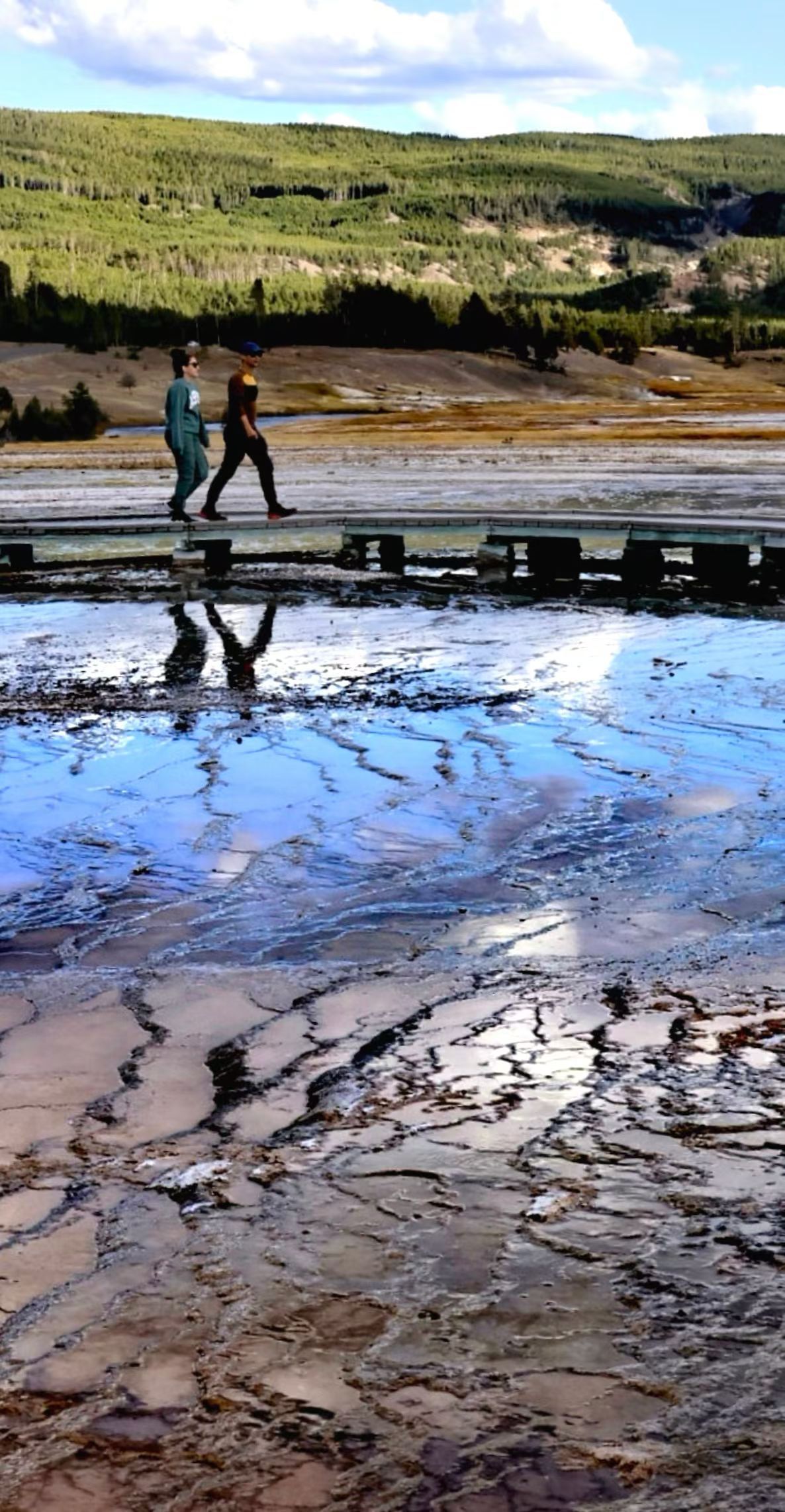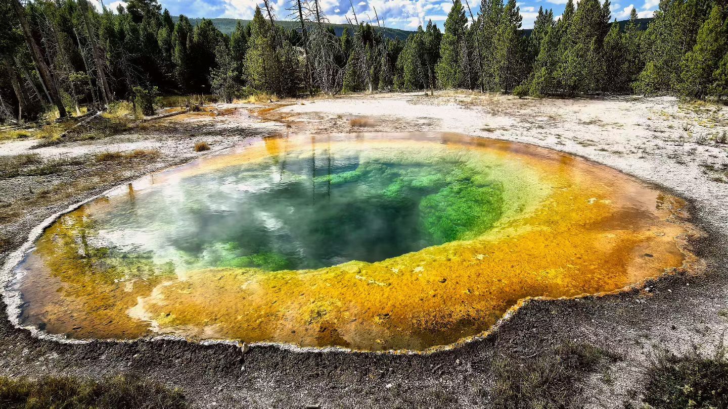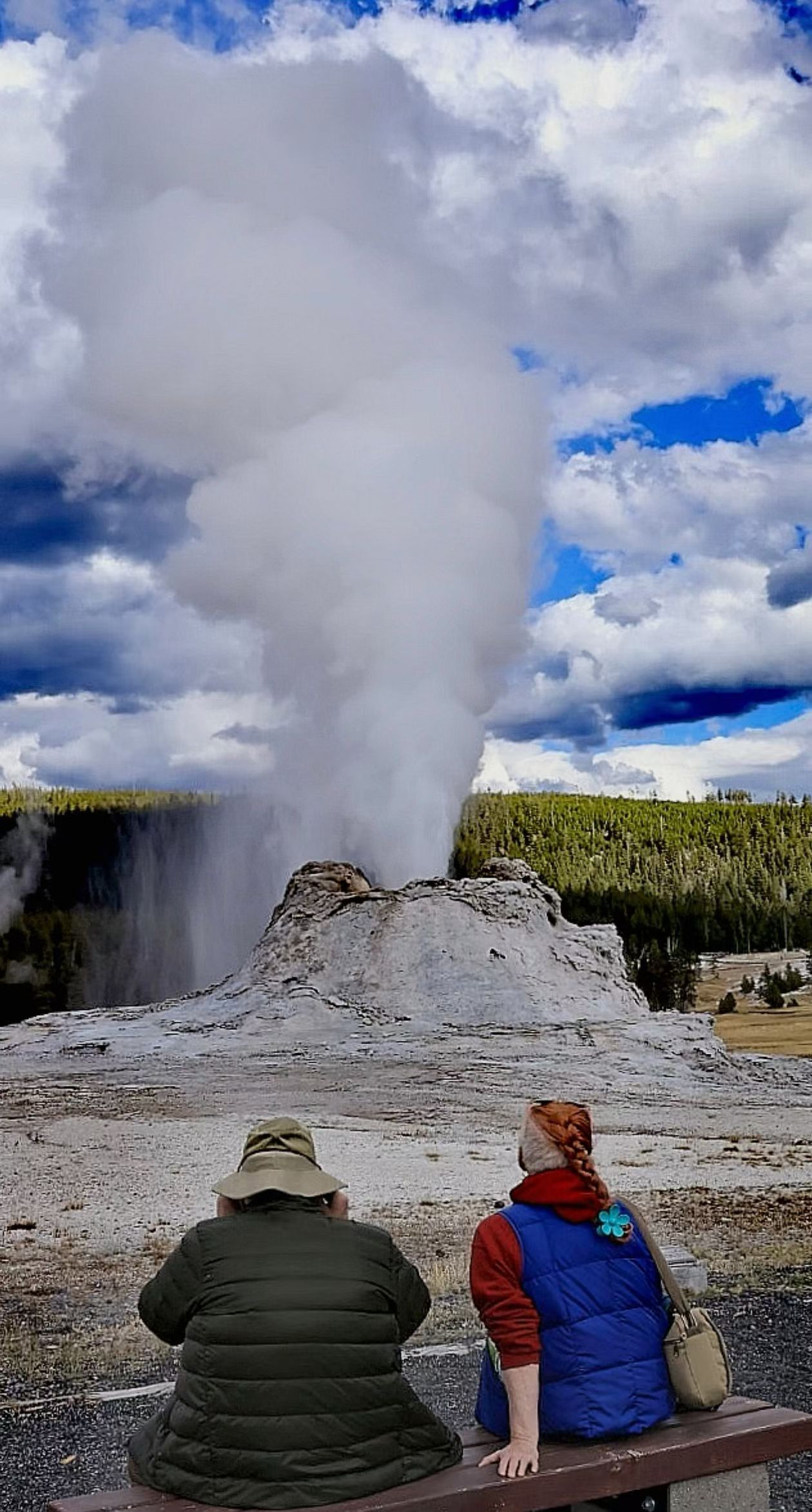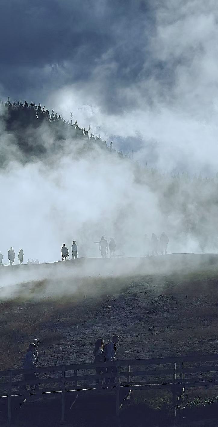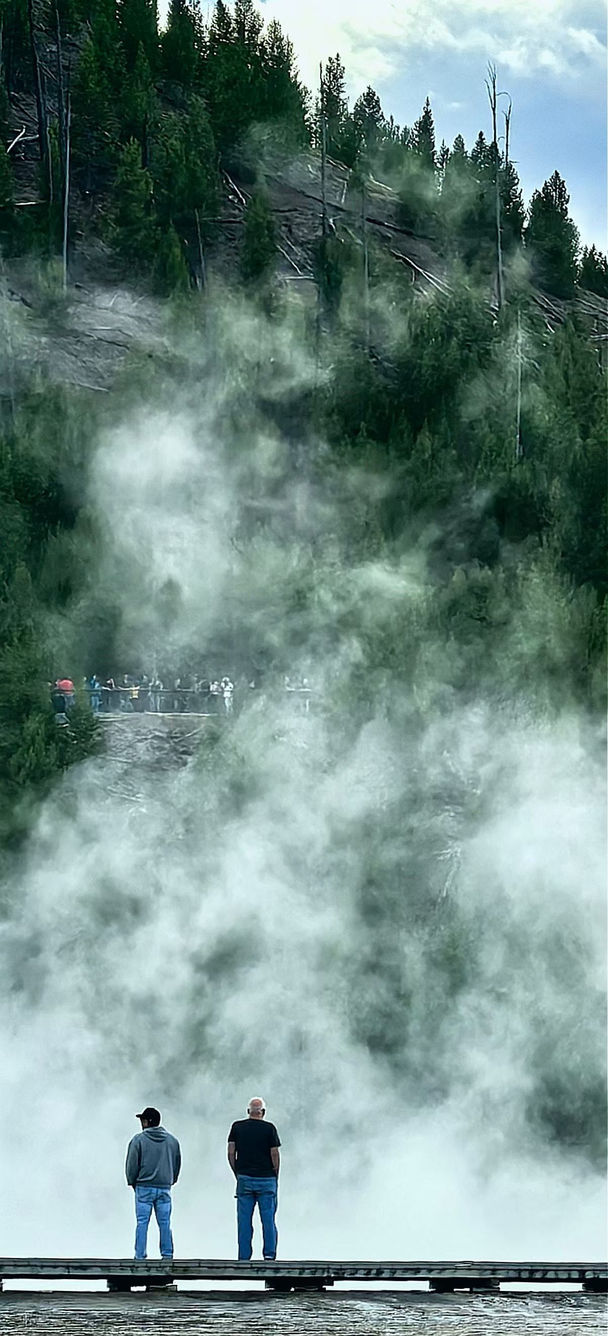 二是处处雾气蒸腾,黄石公园是全世界最大的活火山口,整个公园地下就是涌动翻腾的岩浆,据说这里汇聚着世界一多半的间歇泉和热泉,大大小小有名无名的温泉万余多个。其中老忠泉是最大的看点,因为它极有规律地不到2小时就会忠实地喷发一次,每次一两分钟,喷出的热气最高达百来米。不过,我们在打卡老忠泉的路上,幸运地邂逅了小忠泉(图2)的喷发,它不像老忠泉那么规律,所以更为难得,虽然规模稍小,喷发时间却比老忠泉长得多。