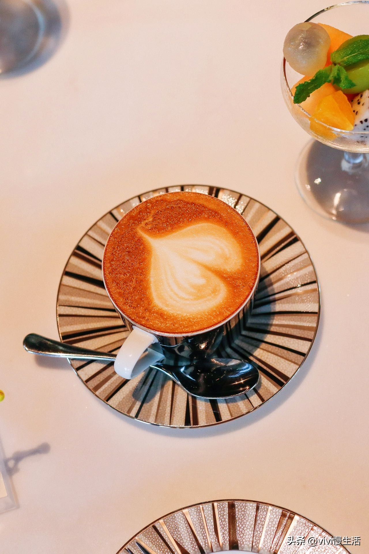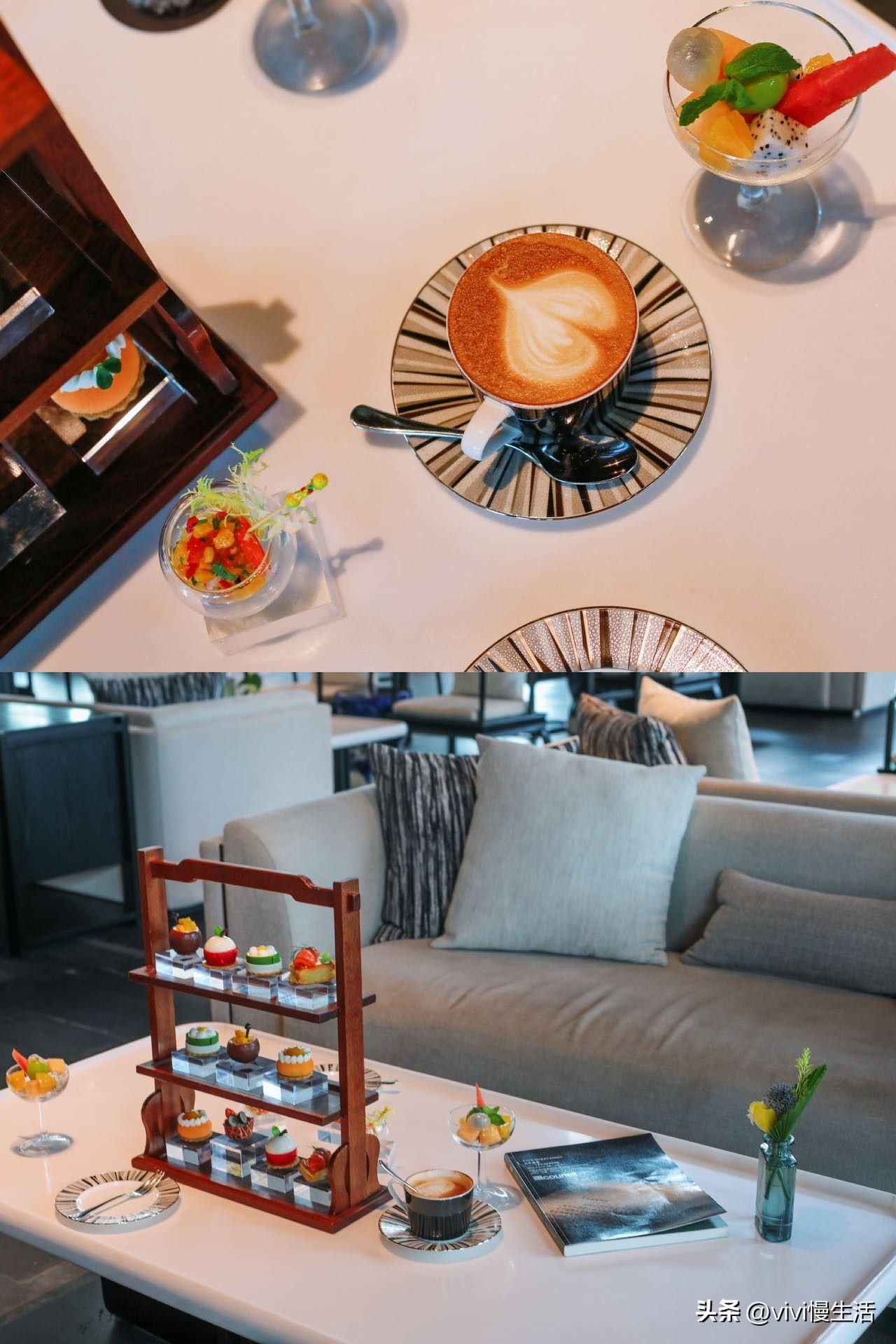 【大堂吧缤纷】双人套餐,咸点 trio 惊喜满满,香芒虾仁沙拉脆挞、牛油果蓝莓脆筒、奇异果烟熏三文鱼,口感层次丰富;甜点更是甜蜜炸弹,芒果慕斯、椰香热带风情等每款都超绝,搭配卡布奇诺,咖啡香混合奶泡,和甜点适配度拉满,味蕾直接开启缤纷漫游