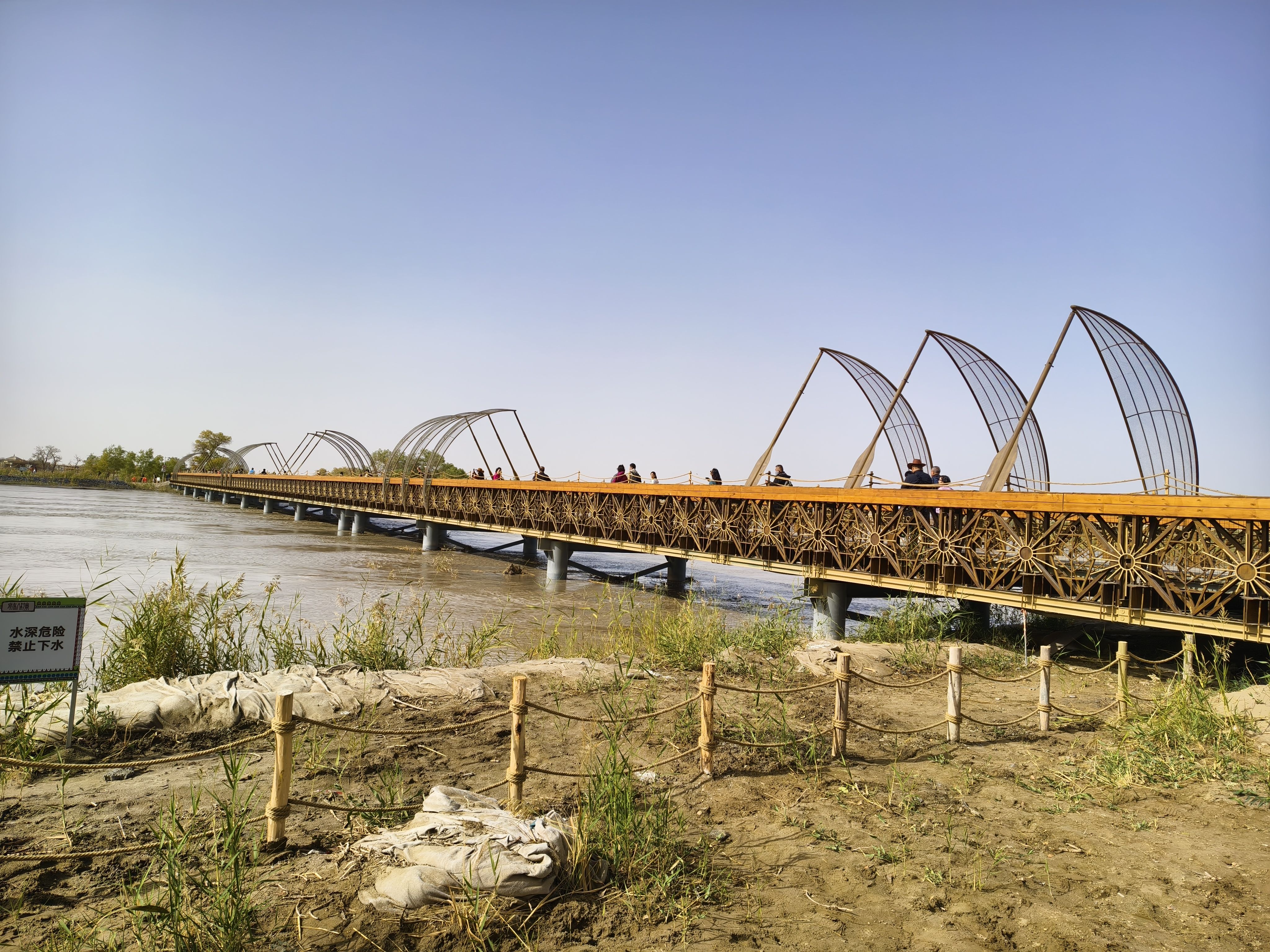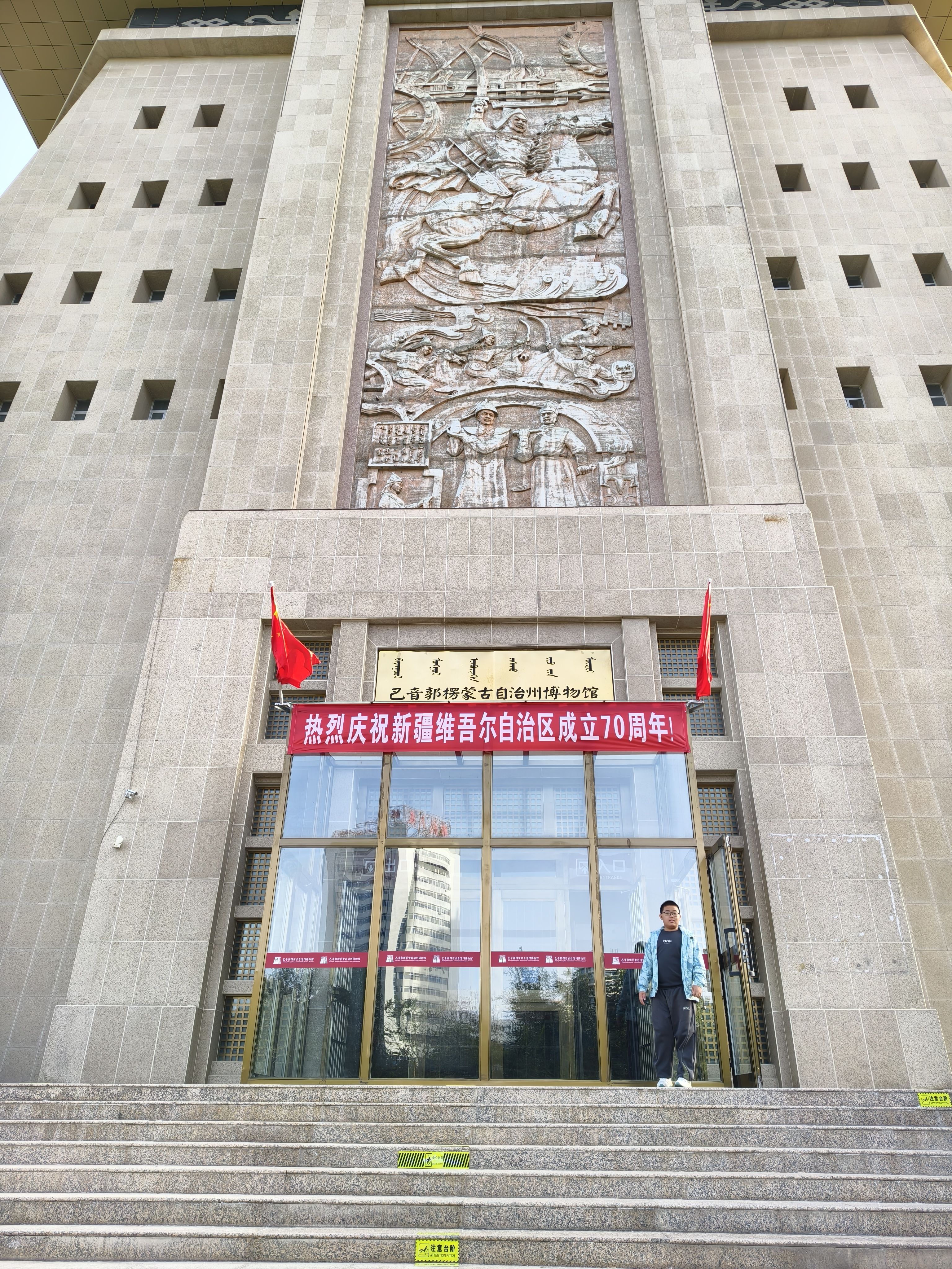 国庆旅游第四天。2025年10月6日,中秋节,大晴天。早上宾馆前旅游车来接,到国家4A景区—罗布人村寨,听说正在升5A。主要景点包括罗布人传统村落、塔里木河、塔克拉玛干沙漠、神女湖等。我们做了越野车冲浪,一路沙漠横行,真是惊险刺激,直接送到沙漠腹地,体验了滑沙,烤鱼是特色,吃饭和纪念品等有点小贵,见了百岁老人。下午旅游车送到国家4A景区、国家二级博物馆—巴州博物馆,馆藏文物7000余件,镇馆之宝有狮纹地毯、楼兰彩棺、楼兰美女干尸和粟特文银碗等,挺现代化的一个馆,我盖了戳留念。随后打车来到龙山公园,位于库鲁克山制高点,全景观景台,俯瞰库尔勒市全景。我们走了网红打卡点:280米的9D玻璃天桥,滑道下桥。过山车、摩天轮等游艺设施都没有玩。晚上又来到亲水湾小区对面的天鹅河乘船入口,乘坐夜游船,从民生桥依次穿过七座桥至喀拉苏桥音乐喷泉后原路返回,五彩斑斓的喷泉喷射出各种造型,好漂亮!在船上看库尔勒市的夜景好美。天鹅河、孔雀河、杜鹃河,为库尔勒市增添了无限品味,城市上了档次。北方的城市,没有几座市内有条宽阔的景观河、并且游船可以穿行其中的。40多分钟的水中漫游30元很值。膳缘饭店米饭菜后结束今天的行程。明天下午5:30的火车返回乌鲁木齐。明天还有半天的时间,铁门关景区继续。
