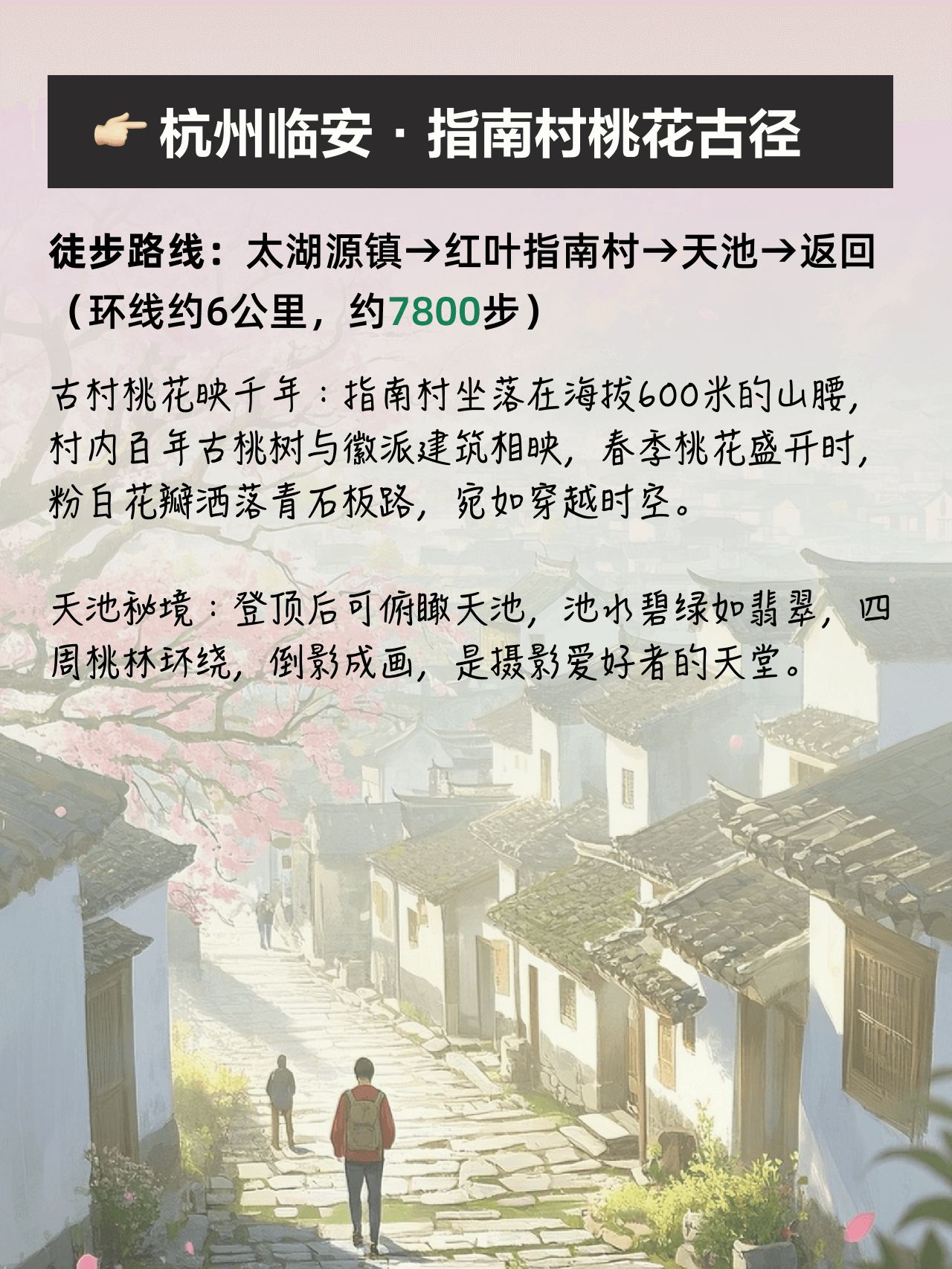 古村桃花映千年:指南村坐落在海拔600米的山腰,村内百年古桃树与徽派建筑相映,春季桃花盛开时,粉白花瓣洒落青石板路,宛如穿越时空。