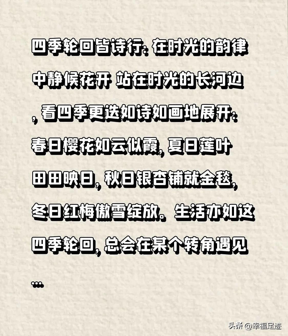 当我们以四季交替的智慧来审视生活,就会明白:春日的播种不必急于求成于秋日的收获,夏日的蝉鸣自有其生命的节奏,秋日的落叶是为了给冬日的蛰伏积攒力量。让我们心怀希望,保有耐心,在时光的长河里优雅前行。因为我们深信,生活总会迎来美好,就像春天总会到来;总有新的故事值得期待,就像四季轮回永不停息。