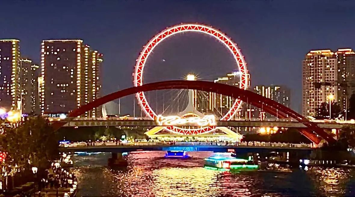 坐上大巴,虽说在楼上由于让位子坐在了第四排,拍照片还是有障碍,但我拍的天津眼永远是我独一无二的,远远地望去天津眼后面的大桥上有机动车辆、海河中有游船在行驶!
