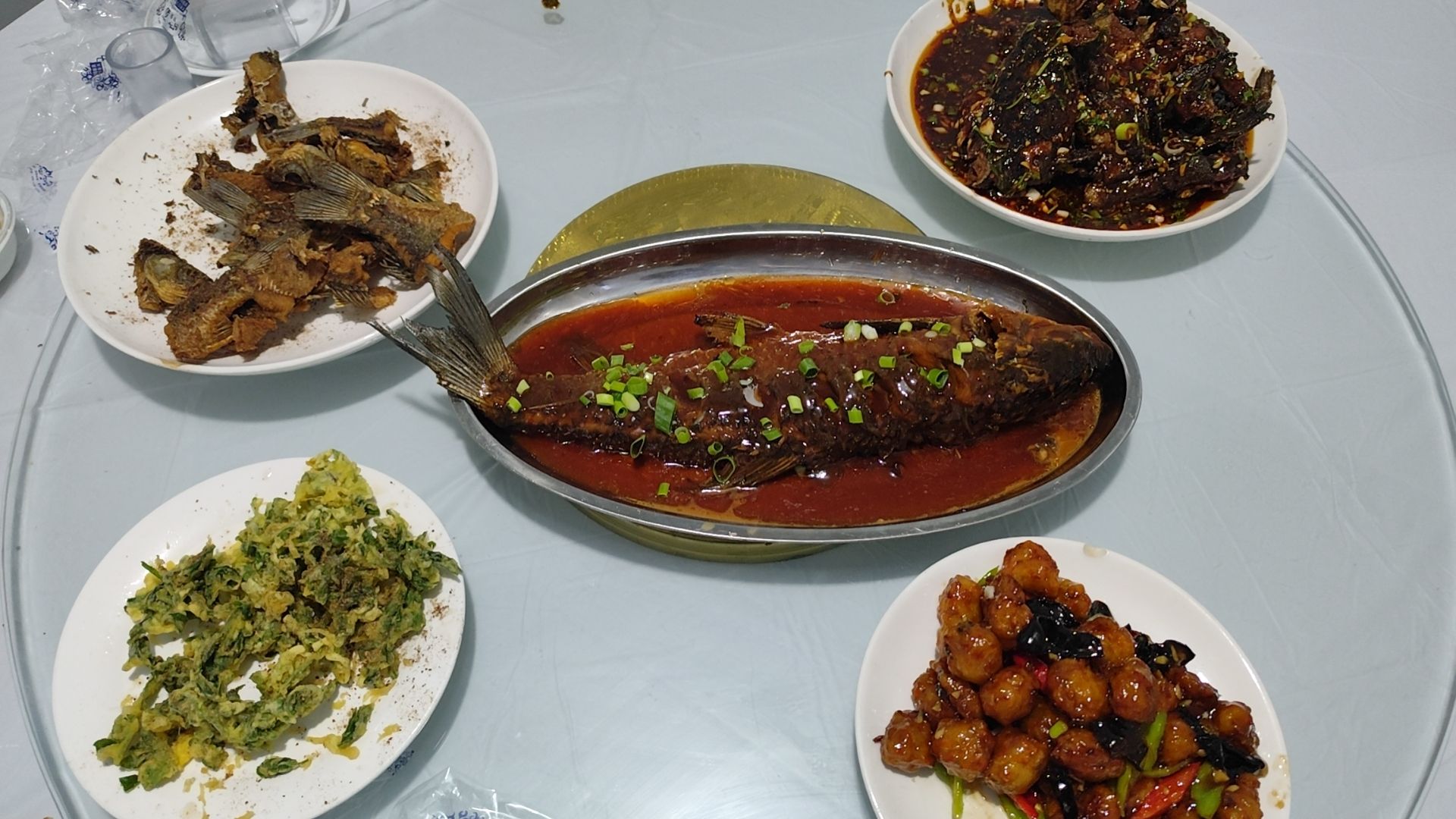 垂钓园提供餐饮加工服务,我们干脆把钓上来的鱼全拿去现做,晚上在这儿吃了顿丰盛的全鱼宴。7条鲫鱼做了干炸鲫鱼和鲫鱼豆腐汤,2条虹鳟鱼一条烤着吃、一条做刺身,鮰鱼弄了怪味儿的,草鱼则是红烧,再点上几道村里的特色菜,味道还是挺不错的。