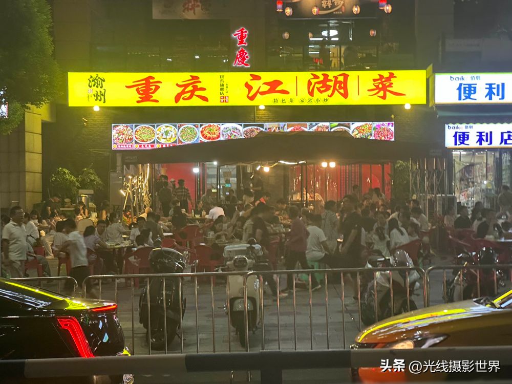 八点半的无人机表演,现场看的人比预想中少。有人举着手机拍月亮,小孩儿提着灯笼在人群里钻。南滨路边一家老火锅店,老板一边招呼熟客一边念叨,“还是自己人自在,不用扯着嗓子说普通话。”