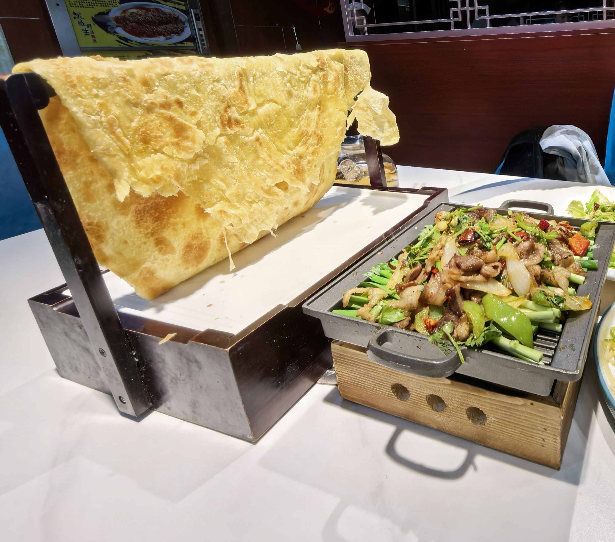 傍晚五点四十分,我们来到离县政府不远的凯盛食府,品尝当地特色。右玉羊肉以其肉质鲜嫩、毫无膻味而闻名,果然名不虚传。再配上造型独特的晾衣大饼,面香十足,筋道可口。这一顿地道的晚餐,为充满历史感与生态启示的一天,画上了一个温暖而满足的句号。
