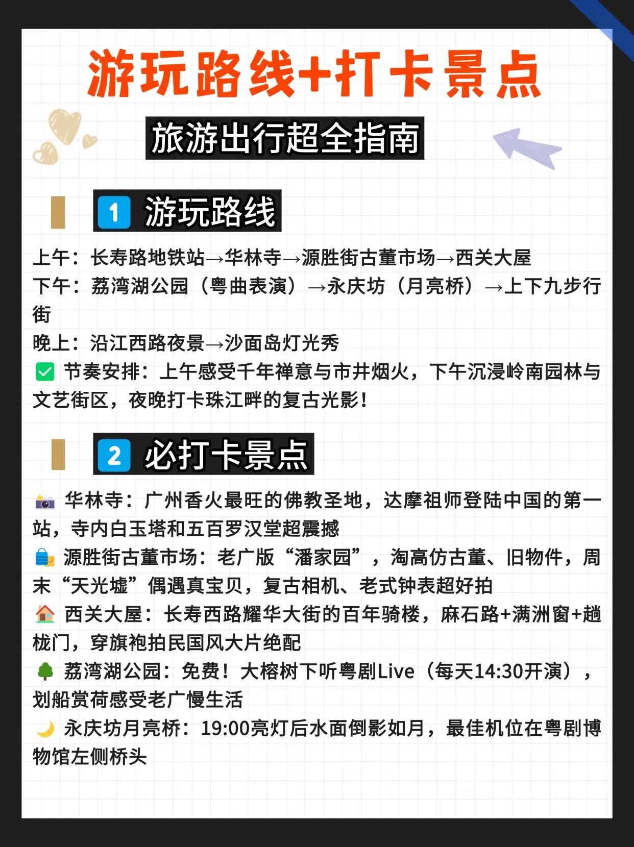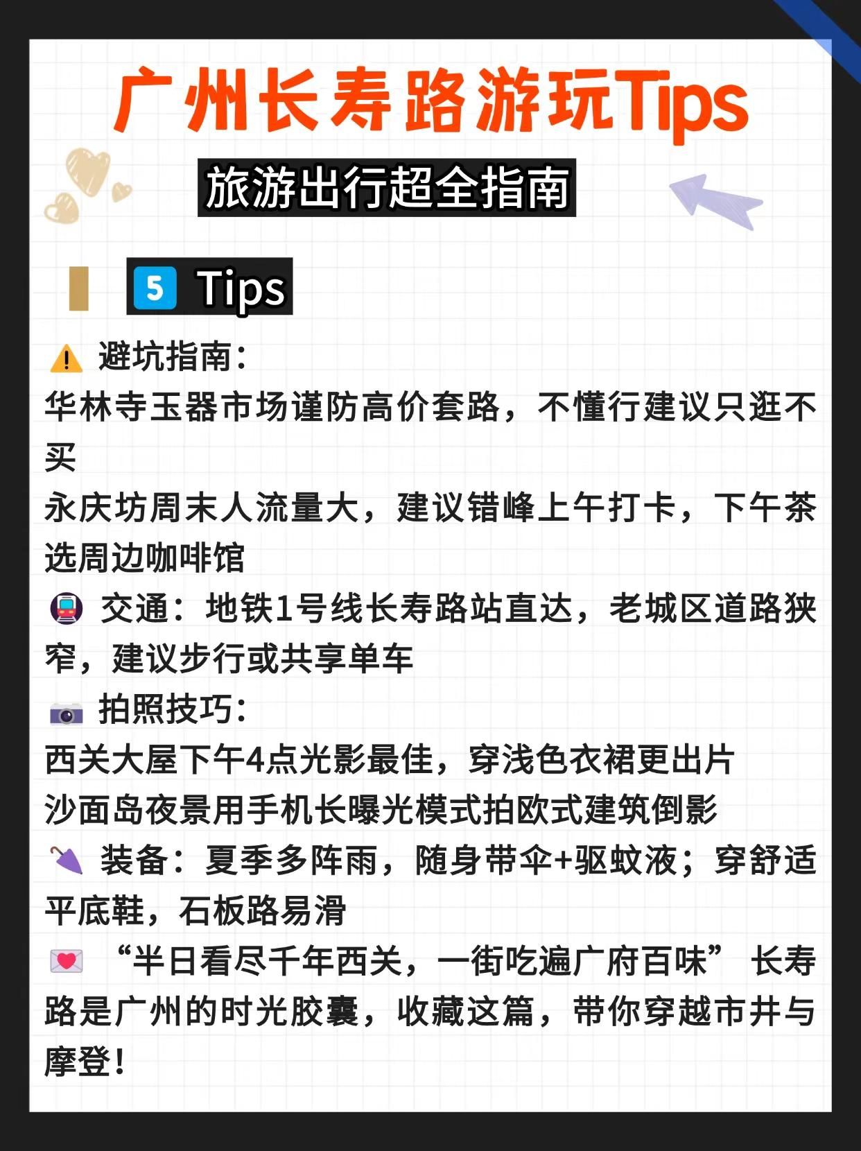 广州长寿路游玩攻略!附行李寄存指南~。 游玩路线上午:长寿路地铁站华林寺源胜街古董市场西关大屋下午:荔湾湖公园(粤曲表演)永庆坊(月亮桥)上下九步行街晚上:沿江西路夜景沙面岛灯光秀 节奏安排:上午感受千年禅意与市井烟火,下午沉浸岭南园林与文艺街区,夜晚打卡珠江畔的复古光影! 必打卡景点 华林寺 源胜街古董市场 西关大屋 荔湾湖公园 永庆坊月亮桥 周边美食打卡 坚记面店:长寿东路的伊府面,牛腩捞面配大地鱼汤底,人均20元饱到扶墙 陈添记鱼皮:西关三宝之一!爽脆鱼皮配艇仔粥,藏在巷子里的美食 宝华面店:鲜虾云吞面竹升面弹牙,汤底用虾籽熬制,30元吃出地道西关味 南信牛奶:双皮奶奶香浓郁,杨枝甘露料足,甜品控必冲 文记河粉:手工现做河粉薄如蝉翼,牛杂炖到软烂,入围必吃榜的街边神店 行李寄存指南 长寿路地铁站寄存点 营业时间:8:00-21:00 位置:长寿路地铁站A口步行60米 收费:背包10元/天,行李箱20元/天 实测:可存30寸以下行李箱,在【行李记】可提前导航查询位置 Tips 避坑指南:华林寺玉器市场谨防高价套路,不懂行建议只逛不买永庆坊周末人流量大,建议错峰上午打卡,下午茶选周边咖啡馆 交通:地铁1号线长寿路站直达,老城区道路狭窄,建议步行或共享单车 拍照技巧:西关大屋下午4点光影蕞佳,穿浅色衣裙更出片沙面岛夜景用手机长曝光模式拍欧式建筑倒影 装备:夏季多阵雨,随身带伞+驱蚊液;穿舒适平底鞋,石板路易滑 “半日看尽千年西关,一街吃遍广府百味” 长寿路是广州的时光胶囊,收藏这篇,带你穿越市井与摩登!#行李寄存 #行李记小程序 #广州 #广州旅游攻略 #广州旅游