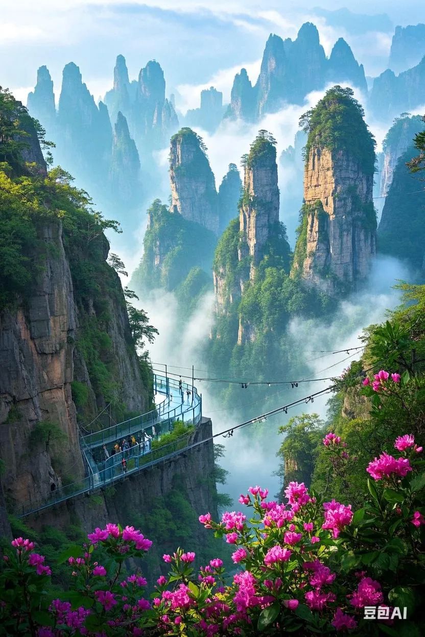 张家界的天门山玻璃栈道与袁家界石柱林在春日云雾中更显神秘。四月的杜鹃花点缀山间,为险峻的山峰增添一抹柔美。