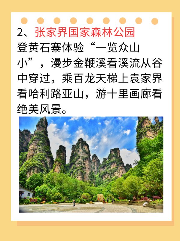 登黄石寨体验“一览众山小”,漫步金鞭溪看溪流从谷中穿过,乘百龙天梯上袁家界看哈利路亚山,游十里画廊看绝美风景。