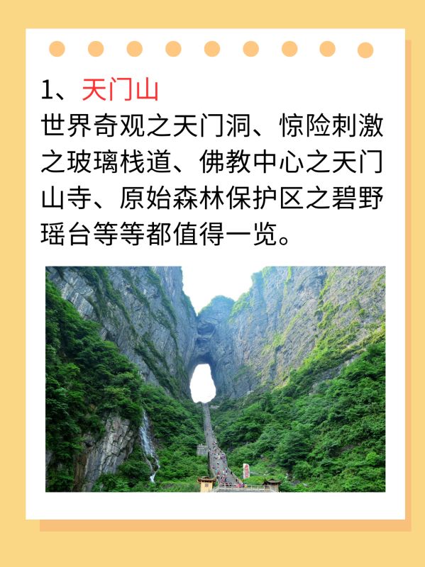 世界奇观之天门洞、惊险刺激之玻璃栈道、佛教中心之天门山寺、原始森林保护区之碧野瑶台等等都值得一览。