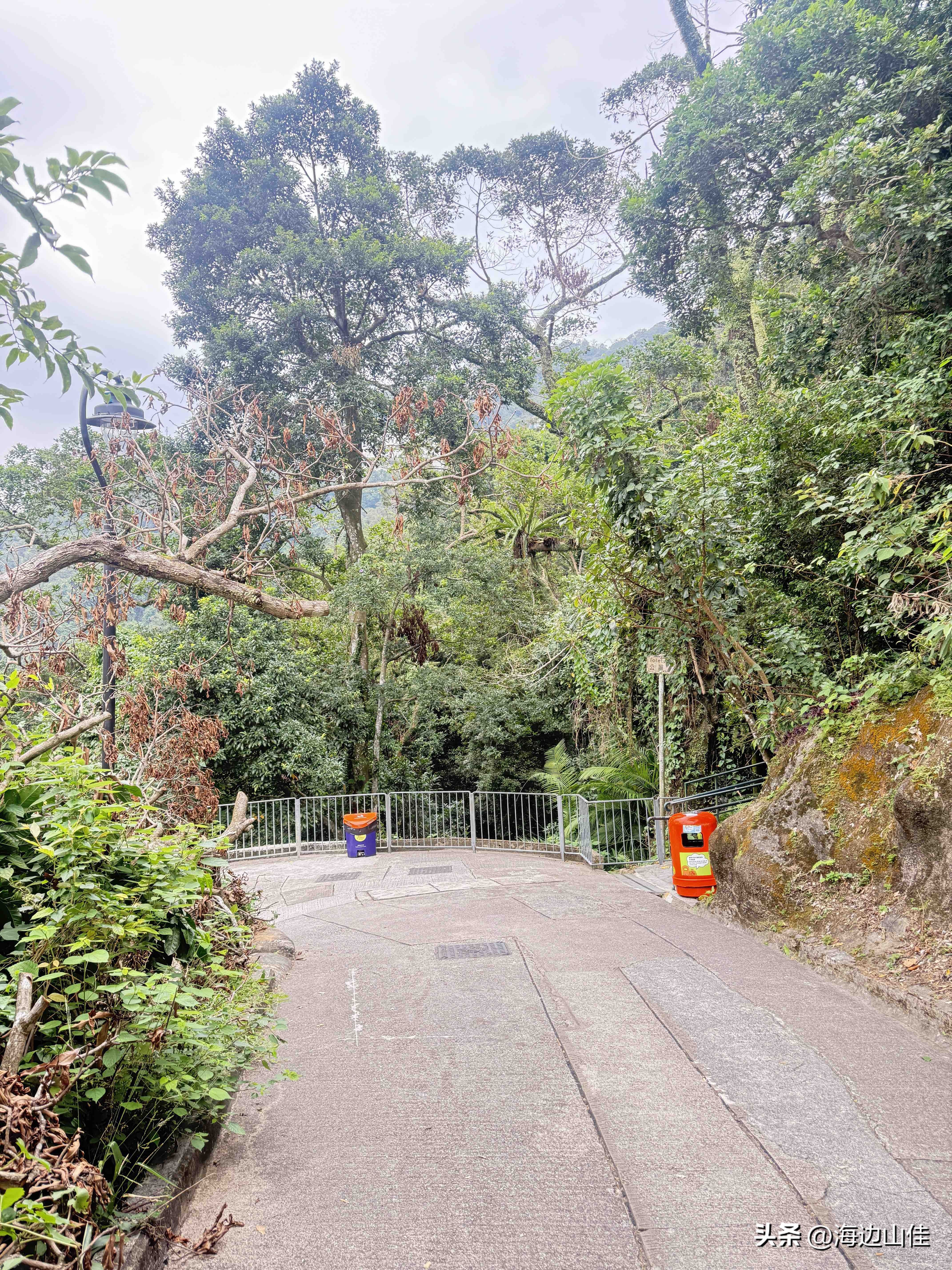 昨天是周末,我们夫妻二人准备了徒步的装备,带了拐杖水和遮阳帽一大早从深圳来到了香港的中环,然后从这里出发,沿阶而上,路过兰桂坊,走出市区,步行沿着旧登山道开始爬太平山,以前我们也多次来到过这里,但每次都是选择坐大巴或是坐缆车上去的,这次之所以选择步行,是想慢慢欣赏一下途中的风景,呼吸下山林中新鲜的空气,的确我们这一路上行,山中树木茂盛、郁郁葱葱、遮天蔽日,人也不很多,空气很好,小路蜿蜒曲折,都是坡路,也很少有台阶,走起来一点不吃力,非常不错,外加沿途还有著名的香港半山豪宅区,看着很普通的一个个小房子,差不多都价值上亿,据说香港的大部富豪们都住在此地,我们到此一游,也算见识到了什么是豪宅,走了近一个半小时,我们到了山顶的缆车站、凌霄阁和山顶广场,这里的风景更是震撼,整个维多利亚港,中环高楼嶙立的金融商业区,甚至整个香港都尽收眼底,美轮美奂,绝对是拍照的绝佳地点,虽然今天有点天公不作美,不算是个大晴天,但还好景色也都看得清,我们也是一通过瘾的拍照。