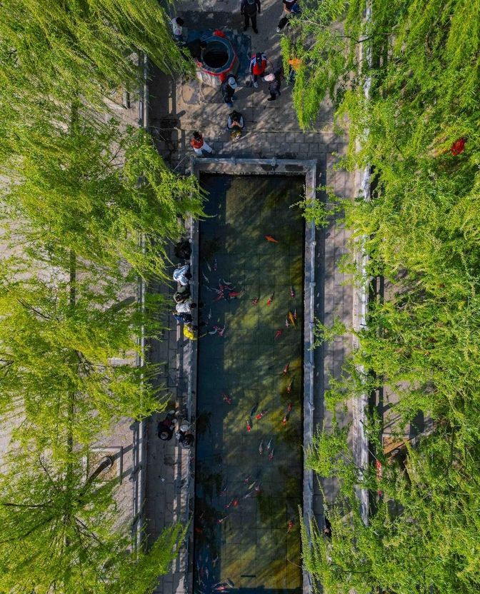 大泉村是个好地方,用无人机从空中俯瞰村口的老井,两边是嫩绿的柳树,水池清澈见底,锦鲤在水中游动,景色非常迷人。