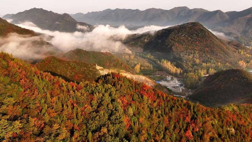 山间,几株常青的松柏点缀其间,那沉稳的墨绿如同画卷上的题跋,稳稳地压住了满山的绚烂,让这热烈的秋色多了几分庄重与沉稳。偶尔,几缕炊烟从山乡的屋檐上袅袅升起,悠悠地飘散在山间,为这如诗如画的静止美景注入了人间烟火的温度与生机。