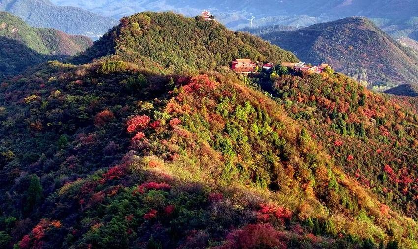 当我登上聚仙观山顶,清冽的山风扑面而来,瞬间将尘世的纷扰涤荡得无影无踪。极目远眺,“万山红遍,层林尽染”的壮丽景象毫无保留地展现在眼前。这色彩,绝非单调的红,而是大自然这位神奇画师挥毫泼墨的杰作。赭石、朱砂、金黄、橙红、绛紫……各种暖色肆意交织、融合、碰撞,如汹涌的浪潮,从山巅奔涌至谷底,又顺着起伏的山峦绵延至天际,勾勒出一幅磅礴而绚丽的画卷。
