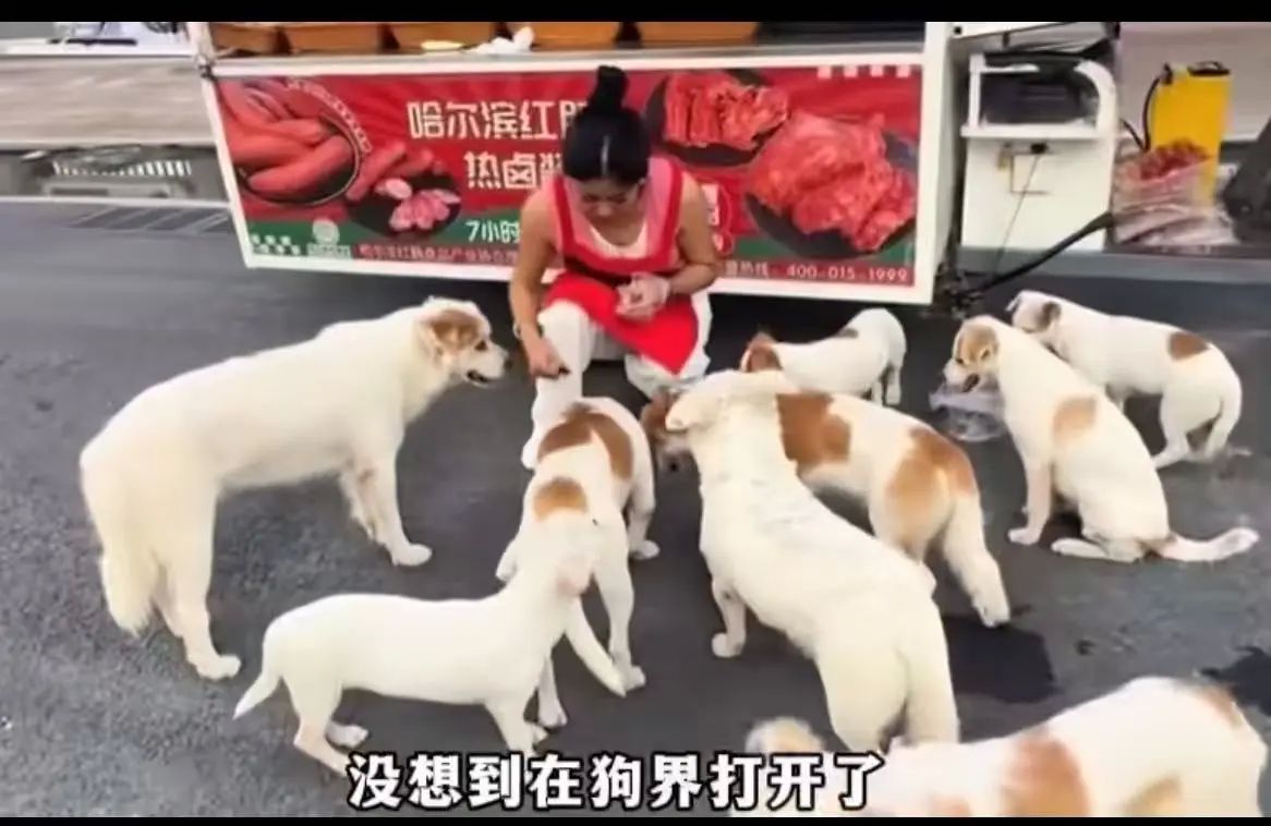 这真的是“有舍就有得”!一个美女摆摊卖哈尔滨红肠,随手喂了流浪狗一口,结果一狗传十狗,十狗传百狗,一呼百应!“狗狗严选红肠”就这样火了!网友:一群人排队,可能担心是托,但是这么多狗排队,我高低要去尝一尝!
