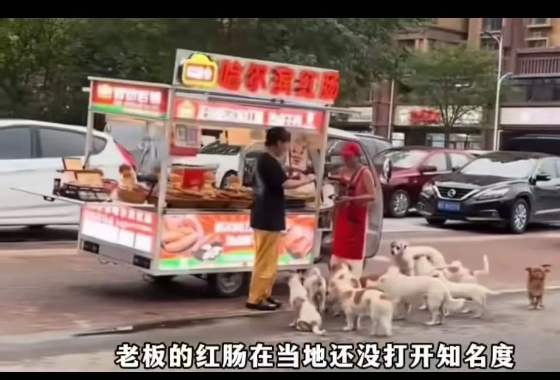 如今林姐的红肠摊前常排起长队,她特意备了个小铁盒,每天留些红肠碎给狗狗们。虽说多了笔“投喂成本”,但这群毛茸茸的“活广告”,反倒帮她把生意做火了。
