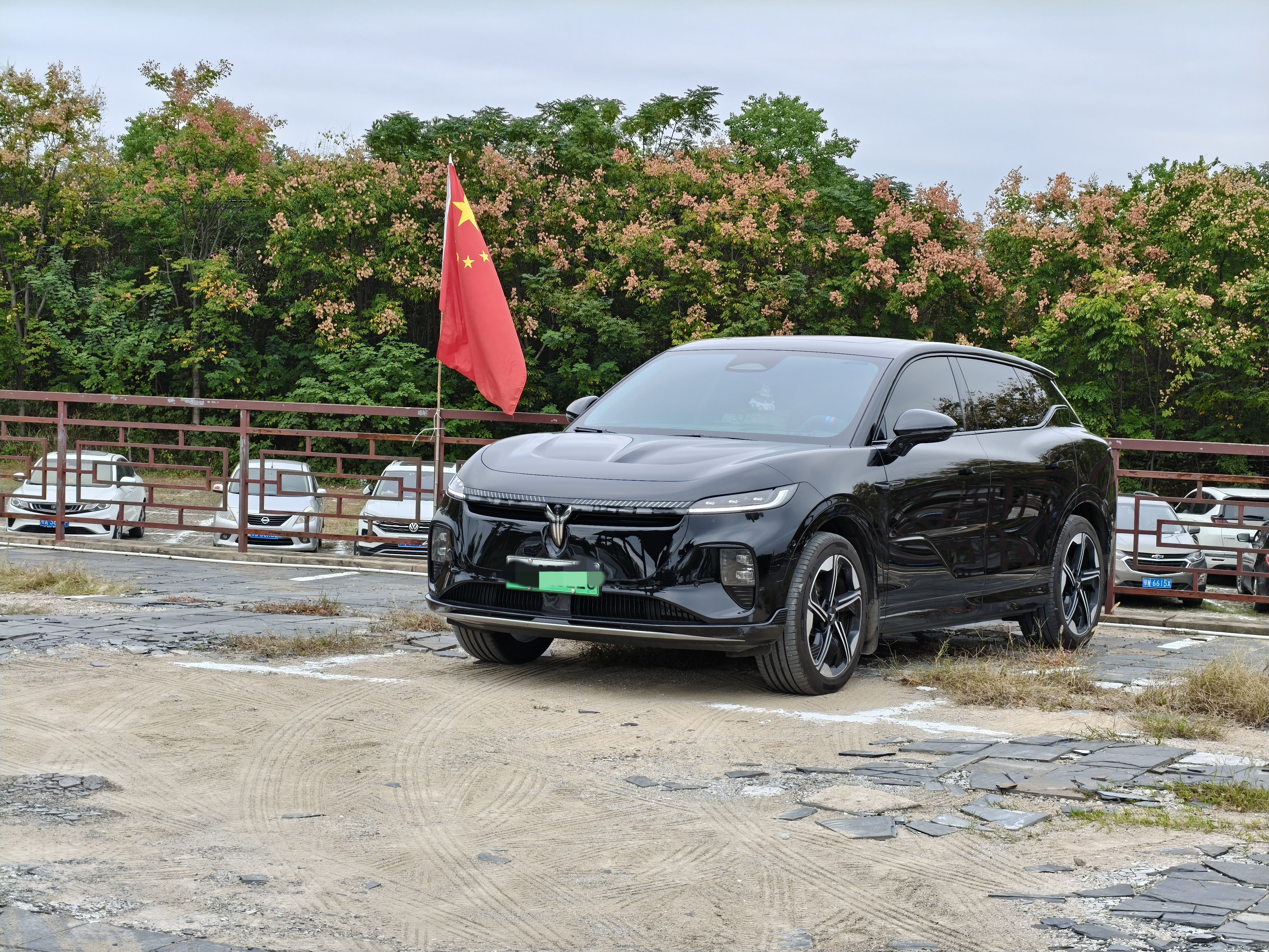 傍晚时分,我们依依不舍地离开了凤娃古寨。回去的路上,我算了算电耗,全程下来每百公里才13.5度电,这一天出行的交通成本20块左右,短途出行还得是电车!老款知音停在景区停车场,搭配上应景的国旗,还是挺帅的。