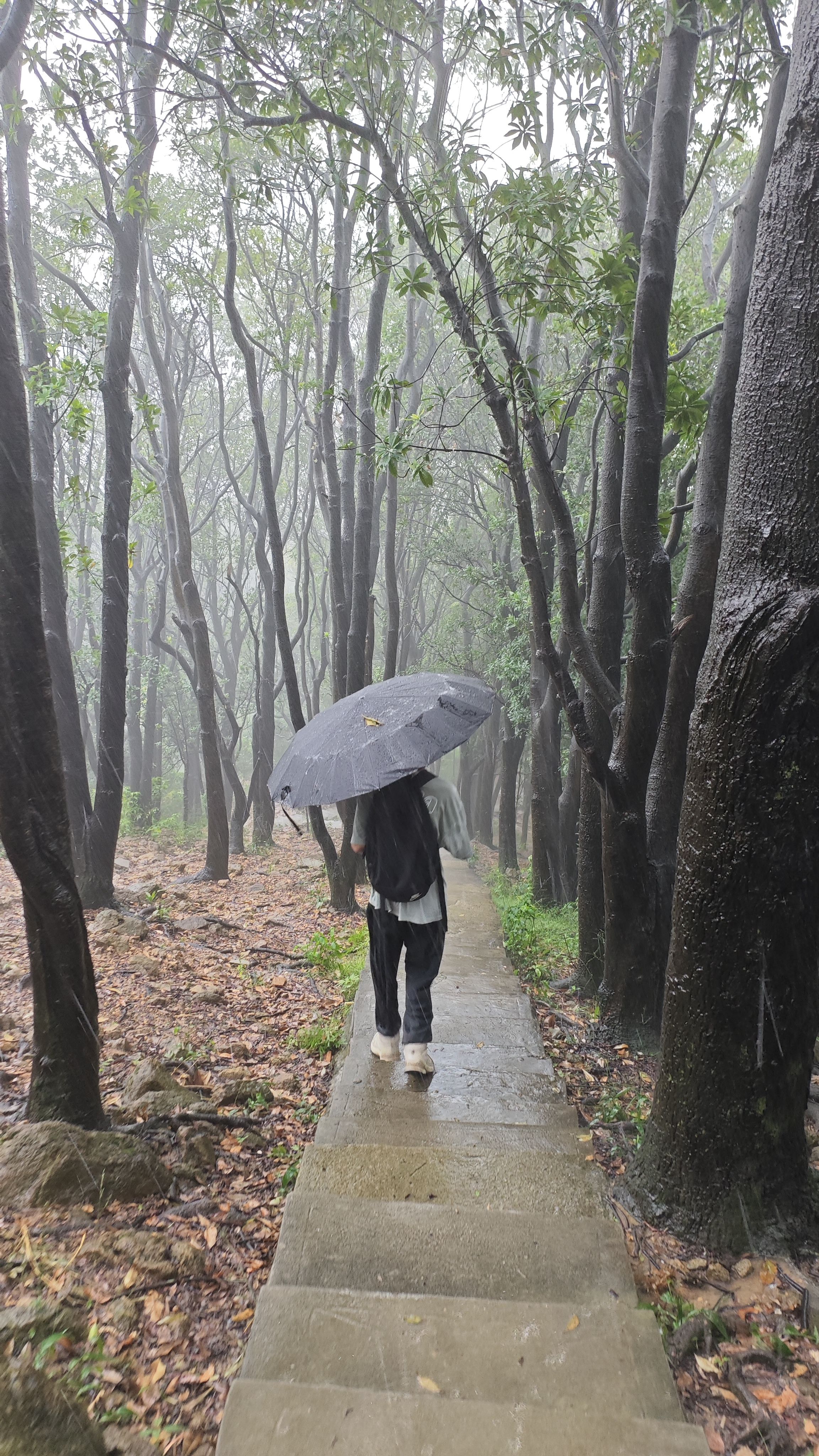 再往前走了一段天又下起雨来,要打伞了,好在登山阶梯砌得非常好,又宽又平又防滑,走起来一点不费劲。