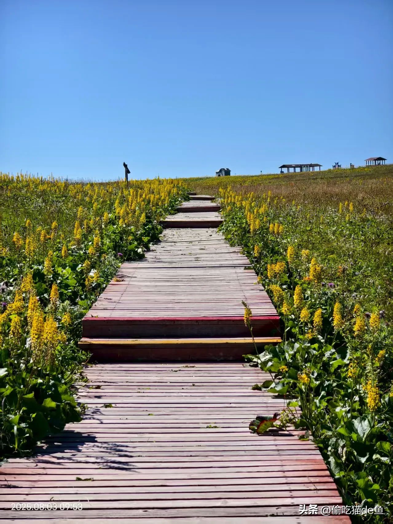 与6年前相比,下车点和草坪入口设置了厕所,7月底8月初应该是舜王坪一年中最美的时候,沿着木栈道走,栈道两边成了花的海洋,真的是“空中花园”。大草坪配上花海,非常漂亮,不愧是“山西最美草原”,此刻才觉得不虚此行。记得6年前来的时候花也只是一片一片的规模并不是很大。最高点是南天门,海拔2358米。