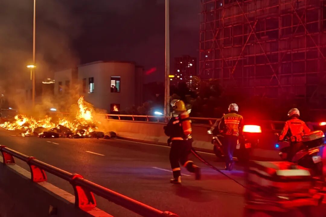 10月29日19时许,福州铁骑巡逻至岳峰高架桥时,发现前方一辆行驶中的大货车货物起火,现场情况危急。铁骑队员迅速将车辆拦停,第一时间上报情况并拨打119,同时使用随车灭火器尝试压制火势。