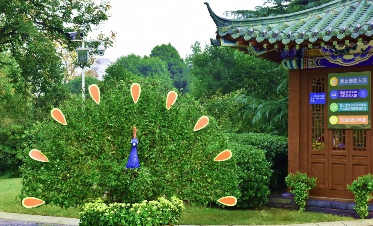 东门广场多彩菊丛形成的绚烂花海格外醒目,有山水造景与古装人物造型、诗意文字等元素。