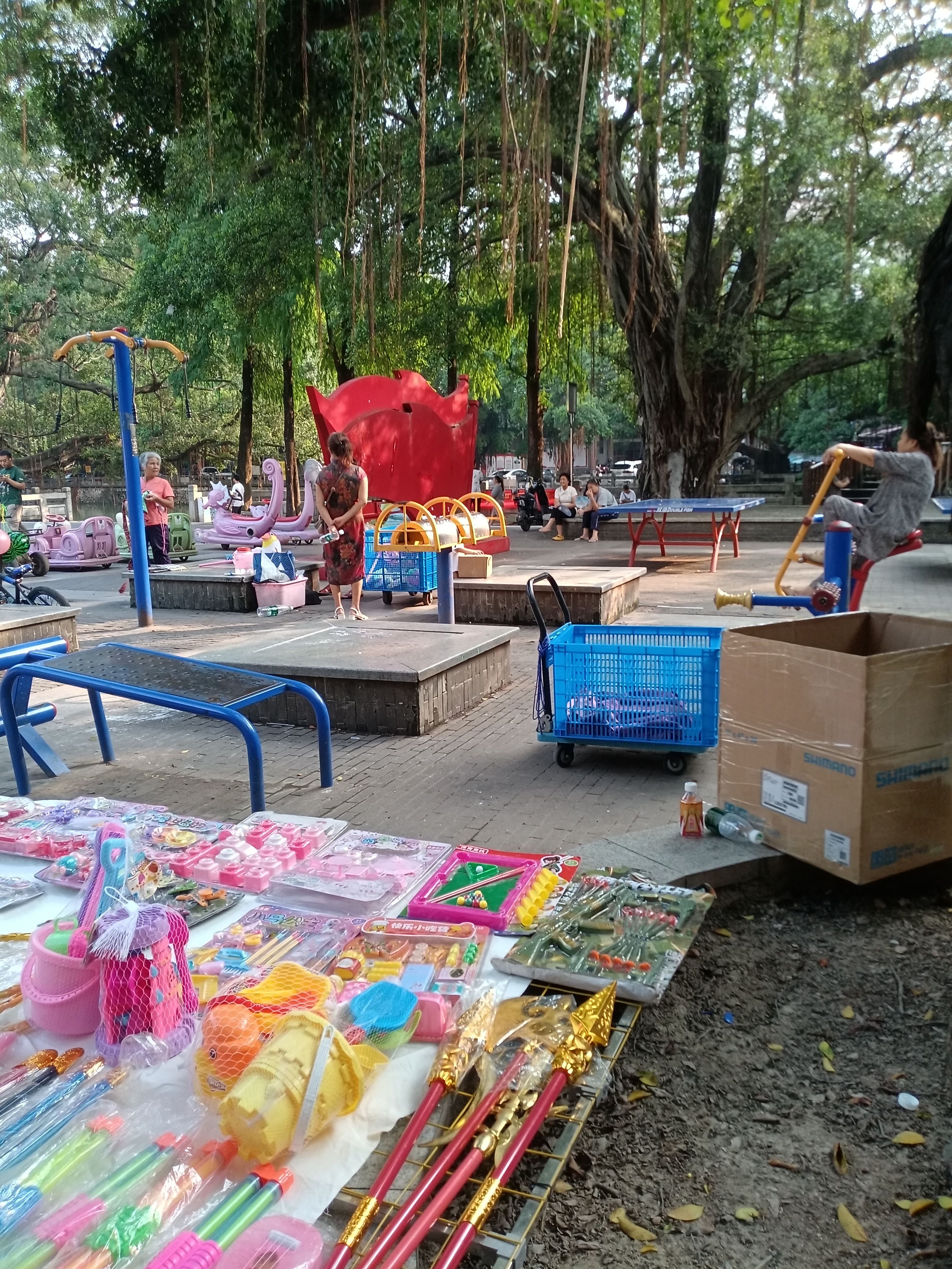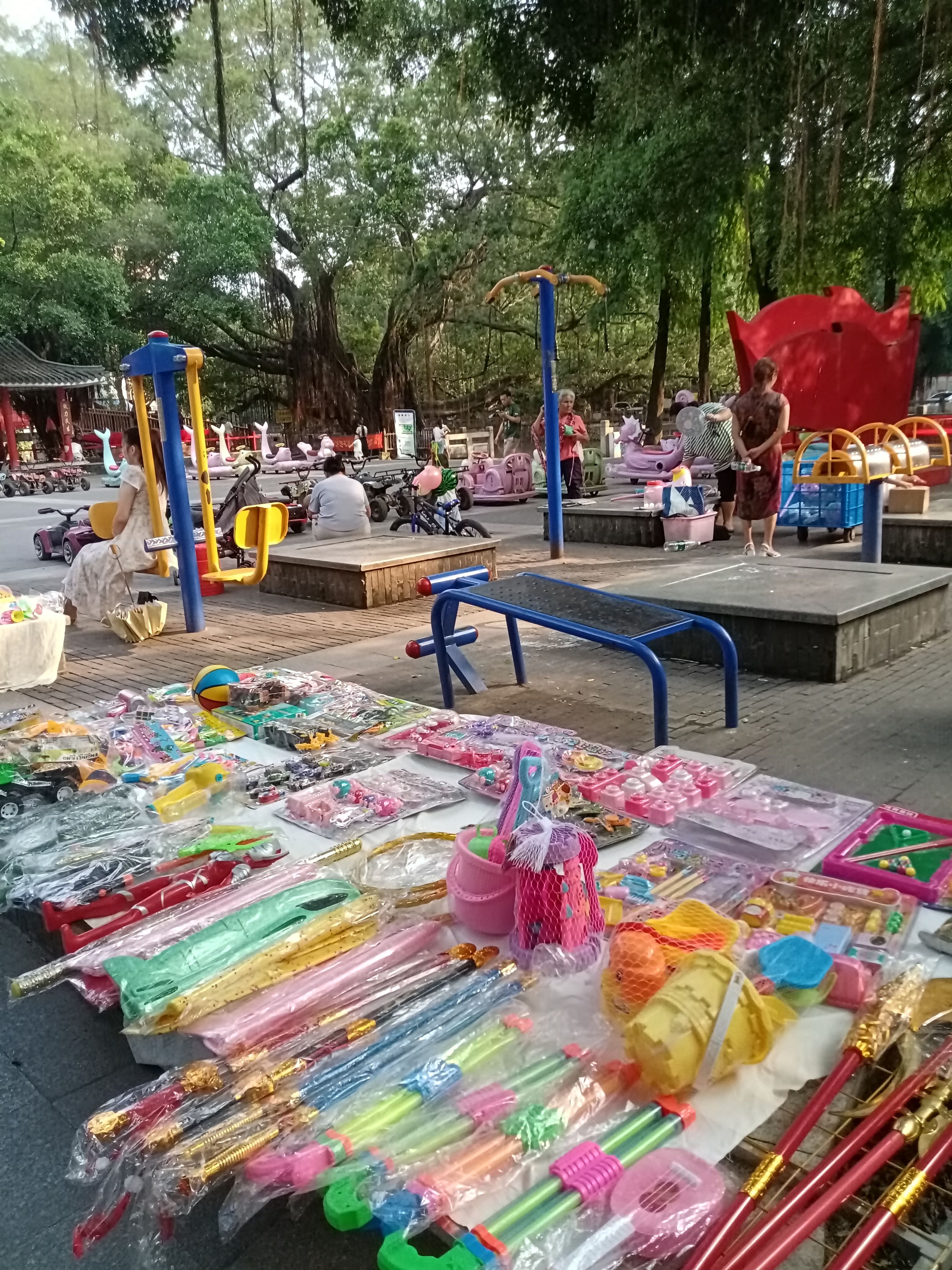 广州龙潭村小公园里面,好多美女宝妈在这里带小孩游玩,公园里面还有好多摆摊卖玩具的,还有遥遥车。