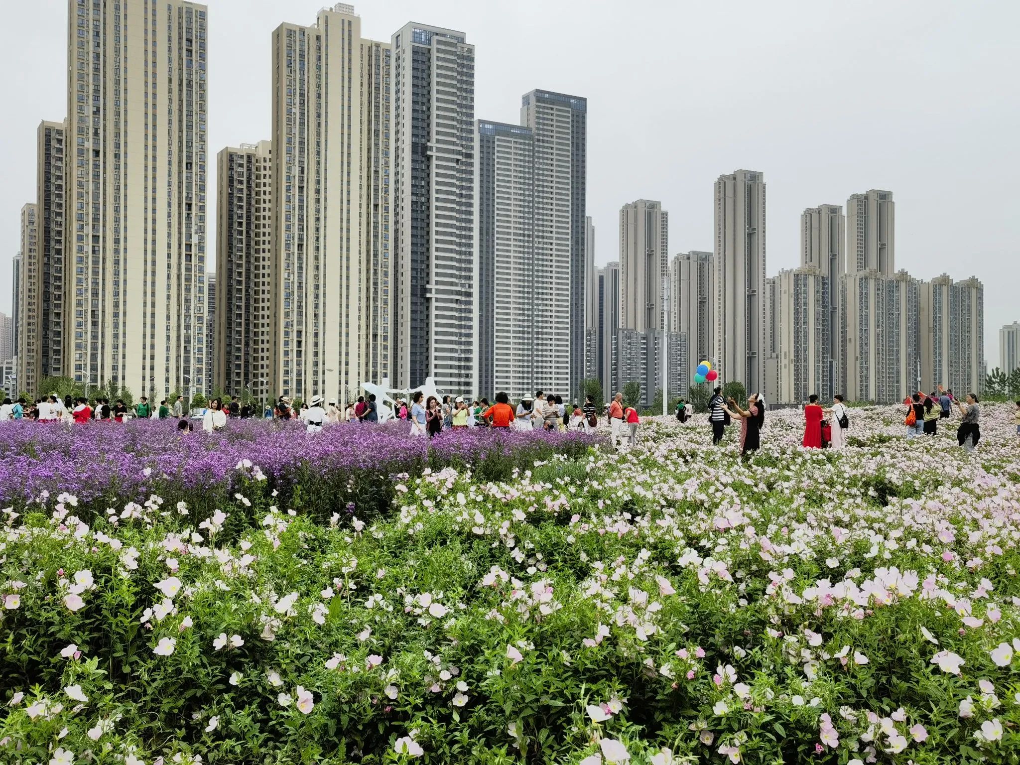 这汉阳汉江湾大约是块未开工的地块,临时利用起来种植了大片花卉。无非是波斯菊、柳叶马鞭草两三种花交错种植,但因为成片,面积够大,所以令人震撼。周边有铁桥和错落的高楼天际线作背景,更显得城在花中。