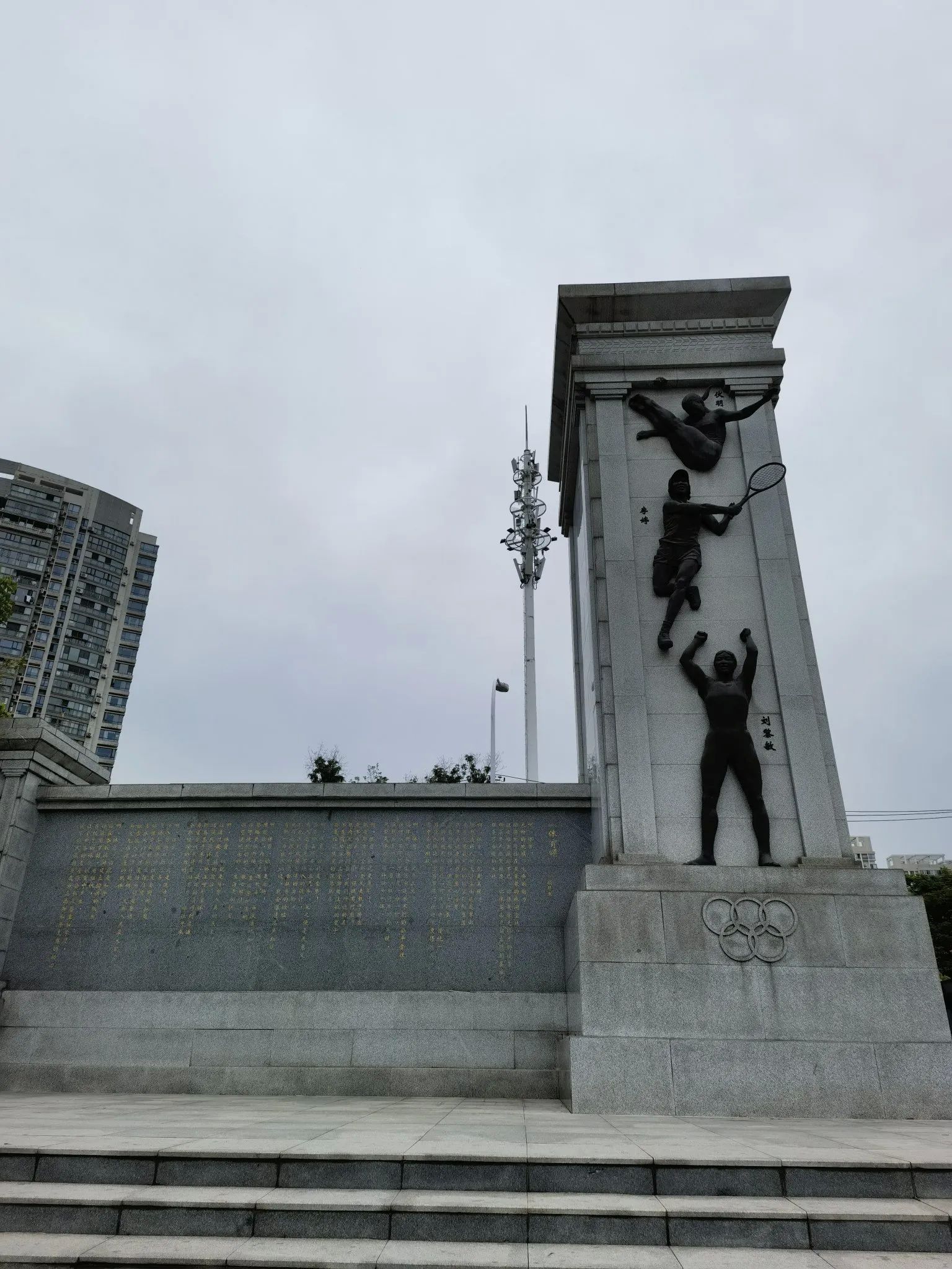 这个公园以体育为特色。大门内两侧刻有硚口区籍世界冠军的名字,满满两面墙!