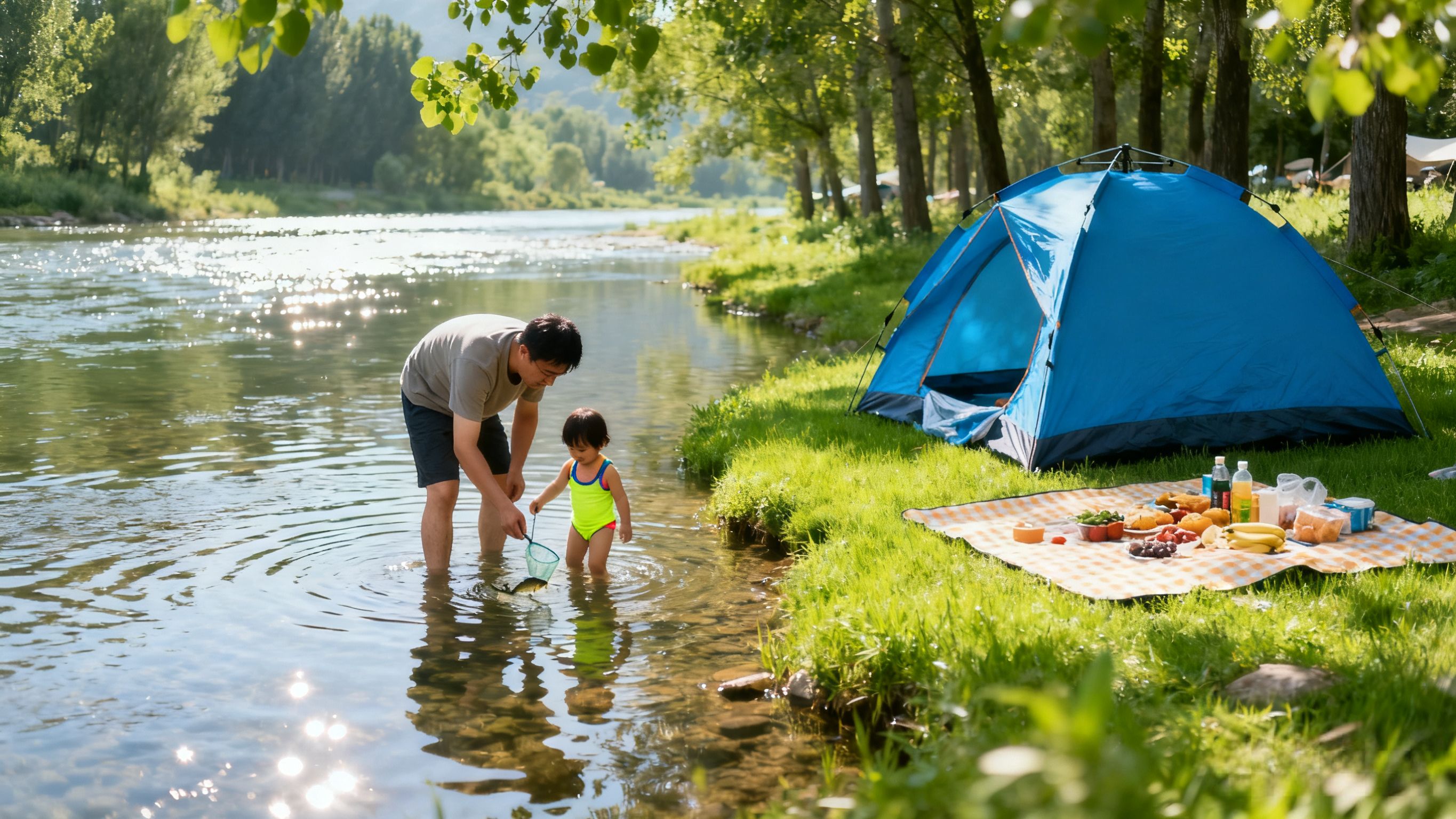3岁以上家庭的亲子露营首选!河水超浅且清澈,捞小鱼、打水仗安全无压力。选块树荫下的空地搭帐篷,煮点泡面、切盘水果,傍晚吹着河风看日落,完美复刻向往的生活。