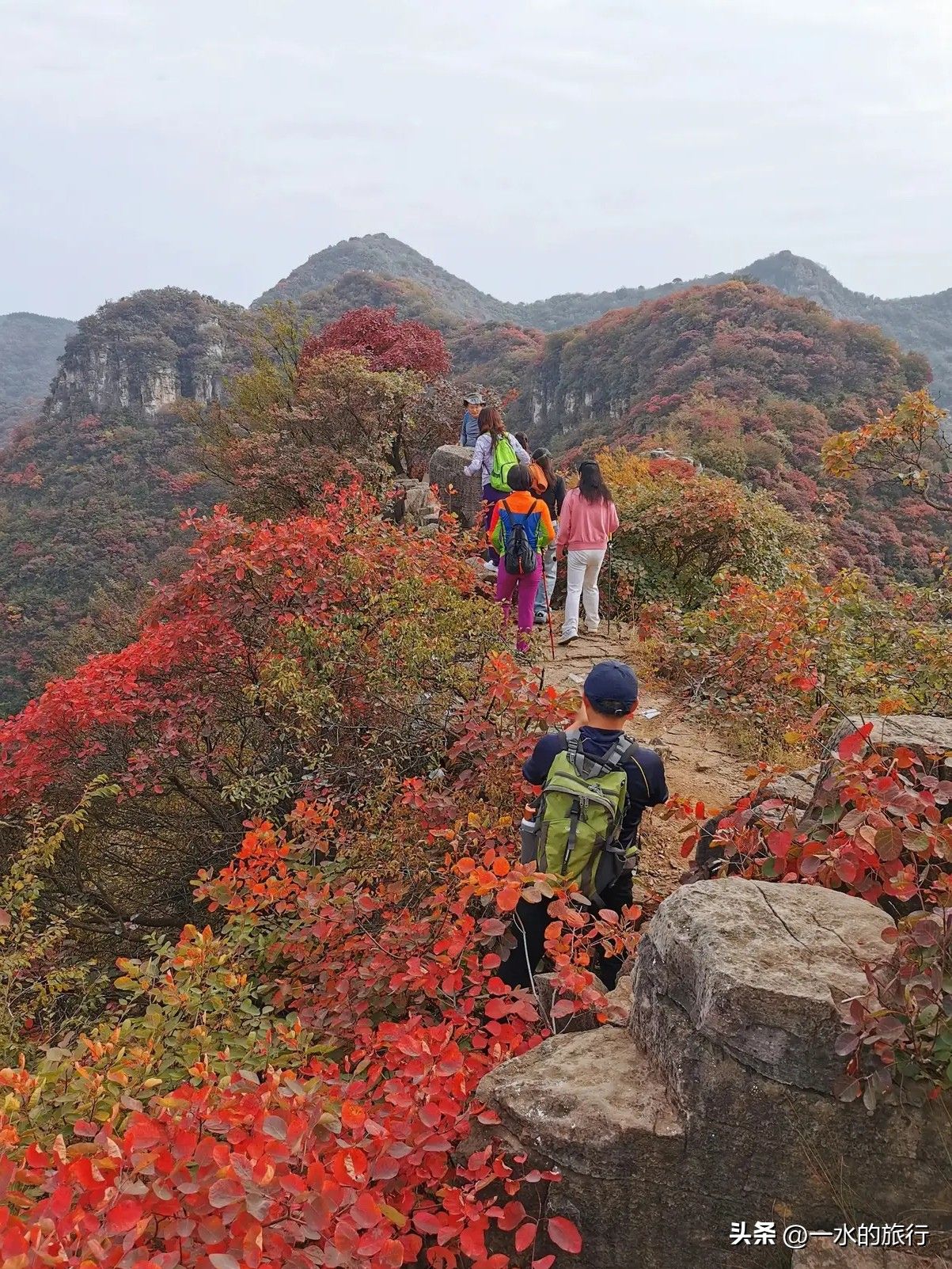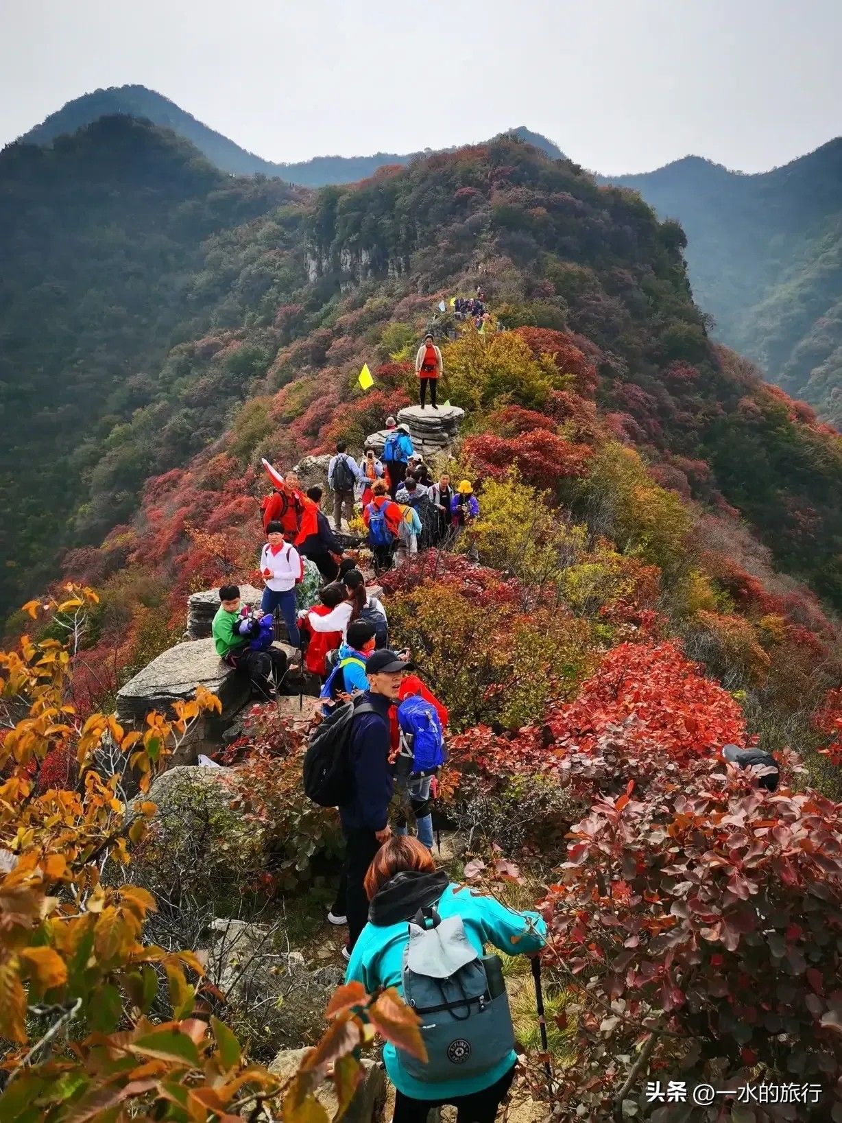 整条山脊全被红叶覆盖,一路爬升一路欣赏,路迹十分明显,坡度不大,对新人十分友好,可带家人孩子游玩。到山顶后,建议原路返回,3公里左右,游玩时间2-3小时。驴友也可继续前行,走小环线4-5公里下山。
