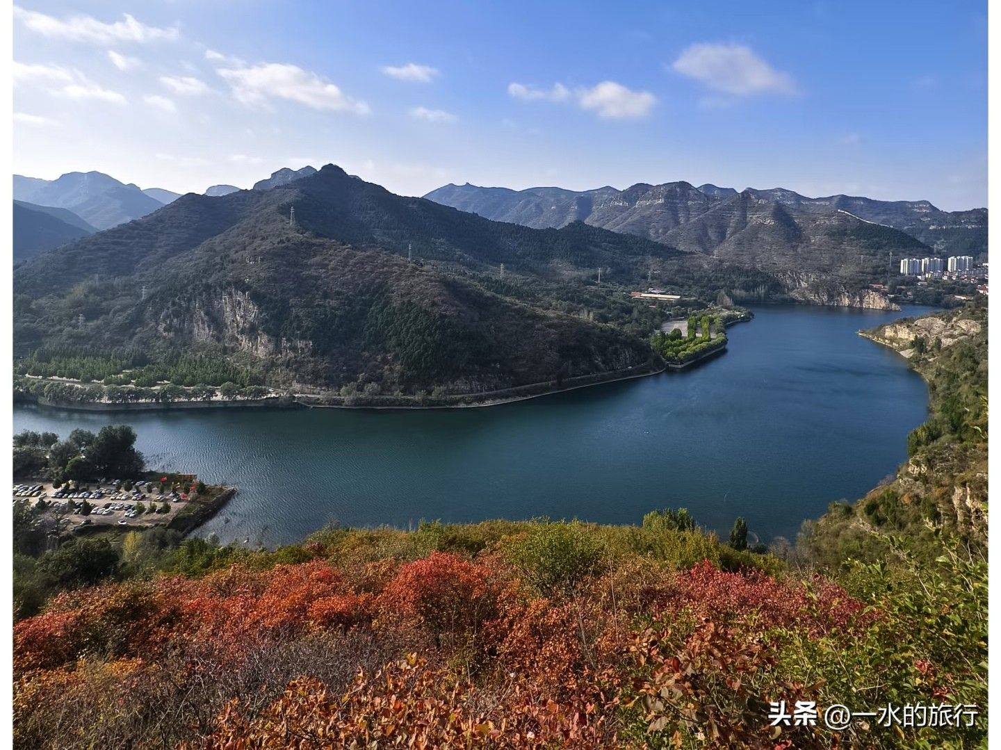 近几年新开发的景区,就在黄花溪对面圣峪口村。她的美,在于群山连绵间,高峡出平湖,在山上俯瞰仁河水库,如碧绿的翡翠,在漫山红叶映衬下,景色非常漂亮。