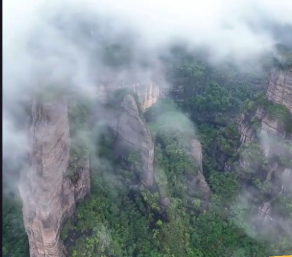 当现代游览设施遇上古老地质奇观,悬空玻璃栈道成为必打卡的"心跳体验"。这条沿丹霞赤壁修建的观景长廊,脚下是百米深渊,眼前是万峰竞秀,云雾翻涌时仿佛漫步天宫。