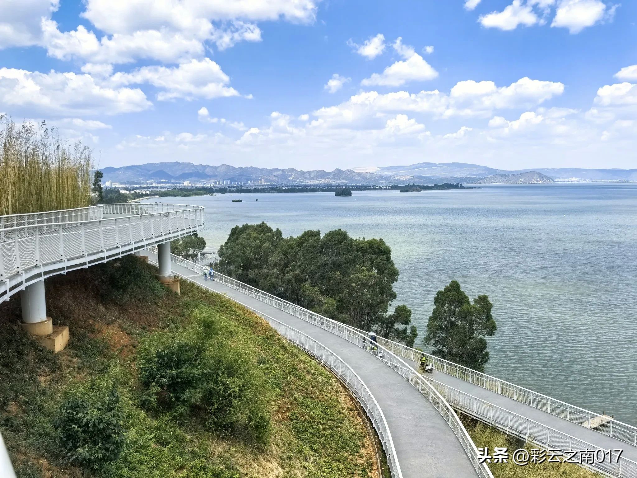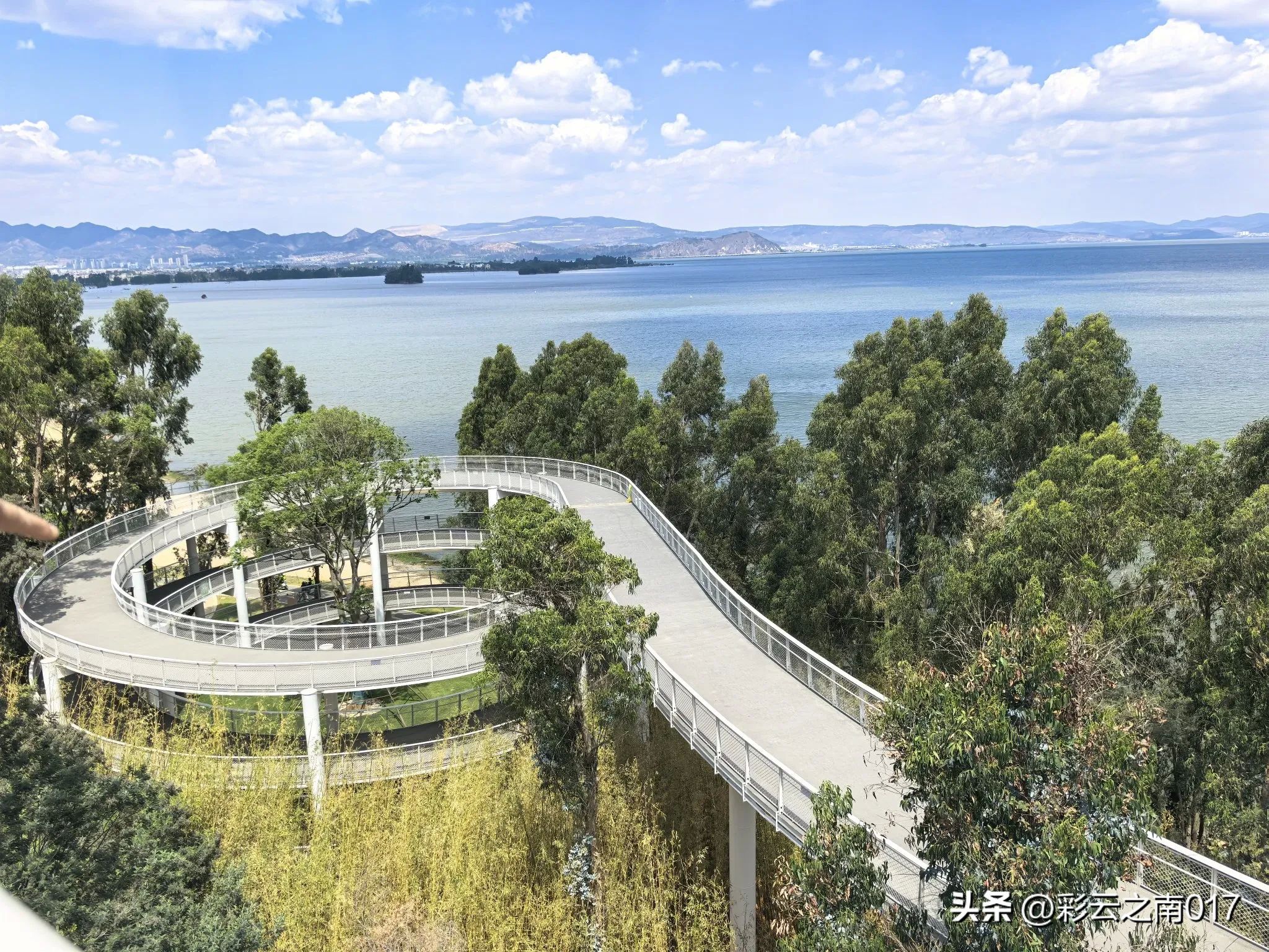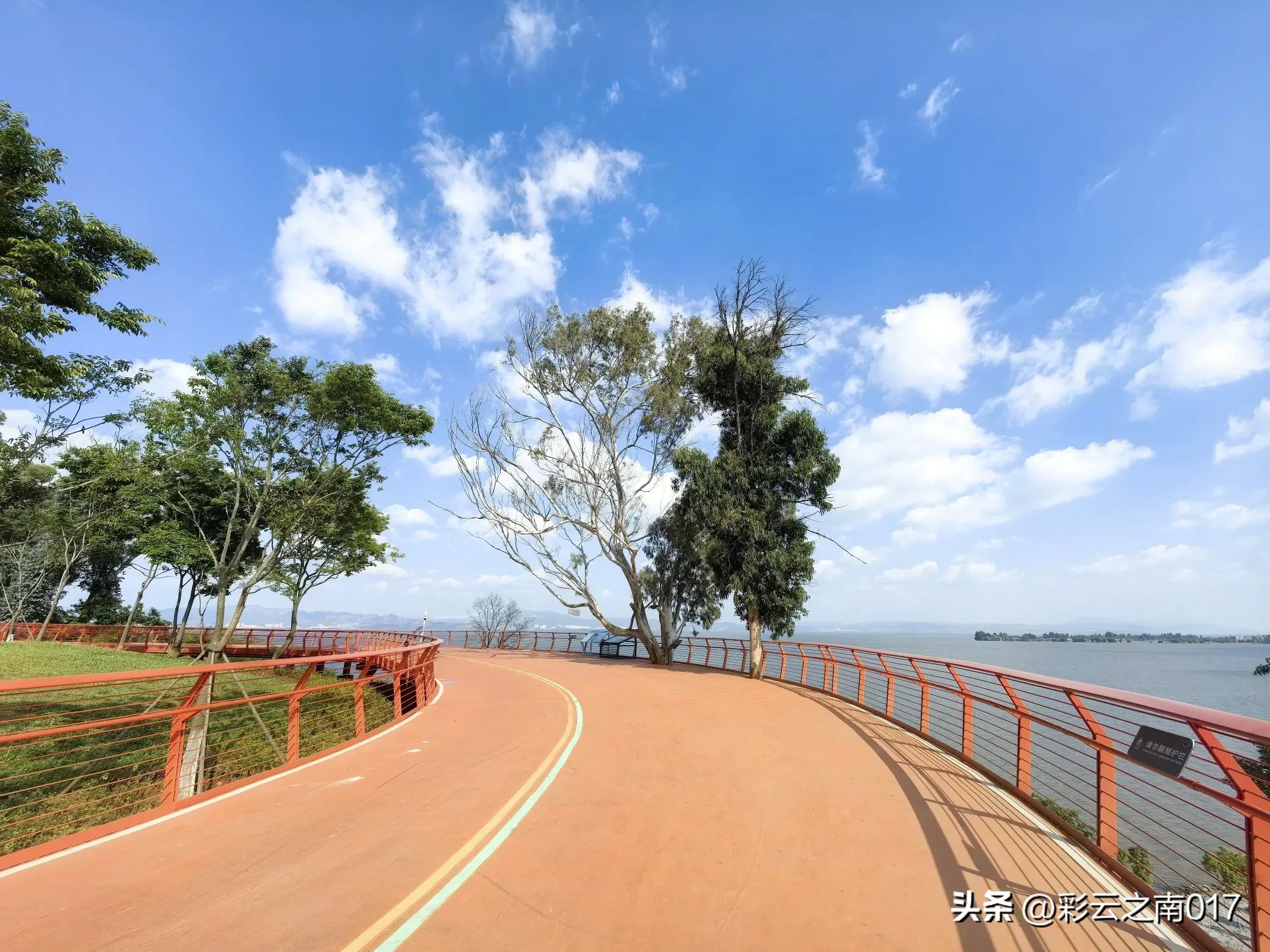 站在绿道高处远眺湖之桥,它宛如一条白色巨龙,横卧于山水之间,气势恢宏,蔚为壮观。蓝天白云之下,滇池水面波光粼粼,碧波荡漾,令人心旷神怡,仿佛所有烦恼都随之烟消云散。