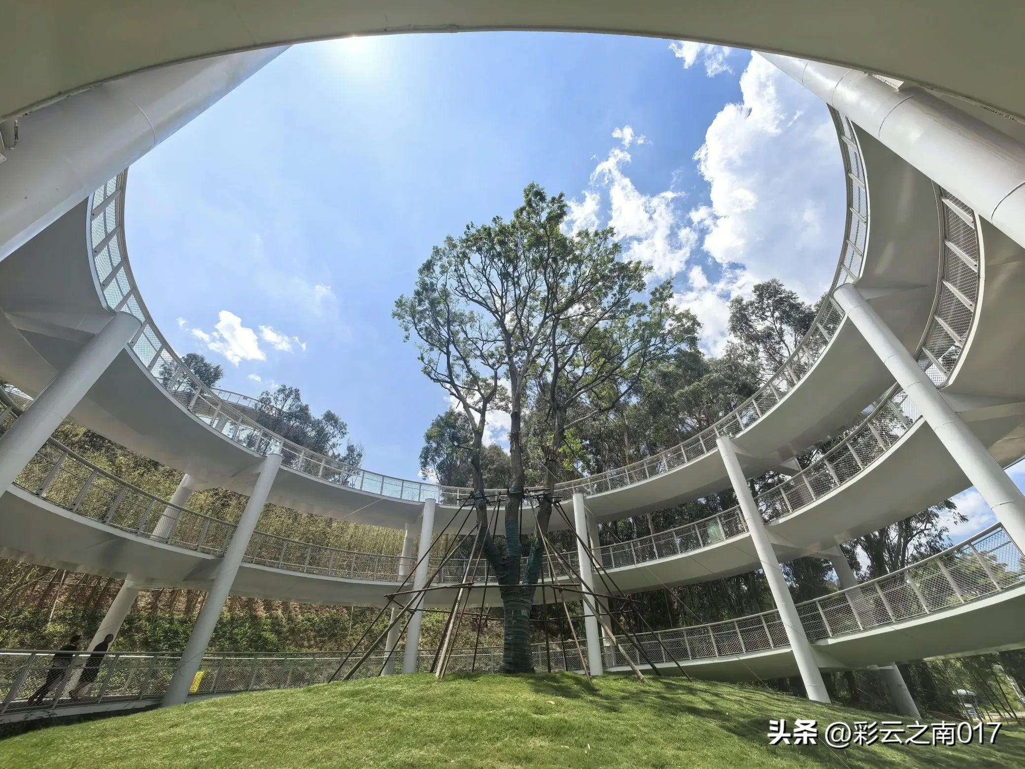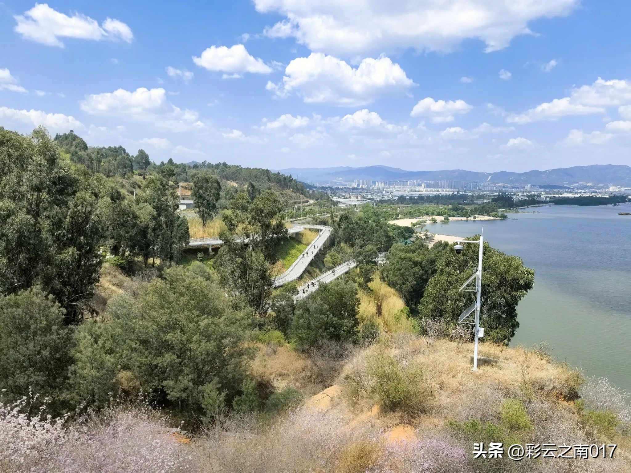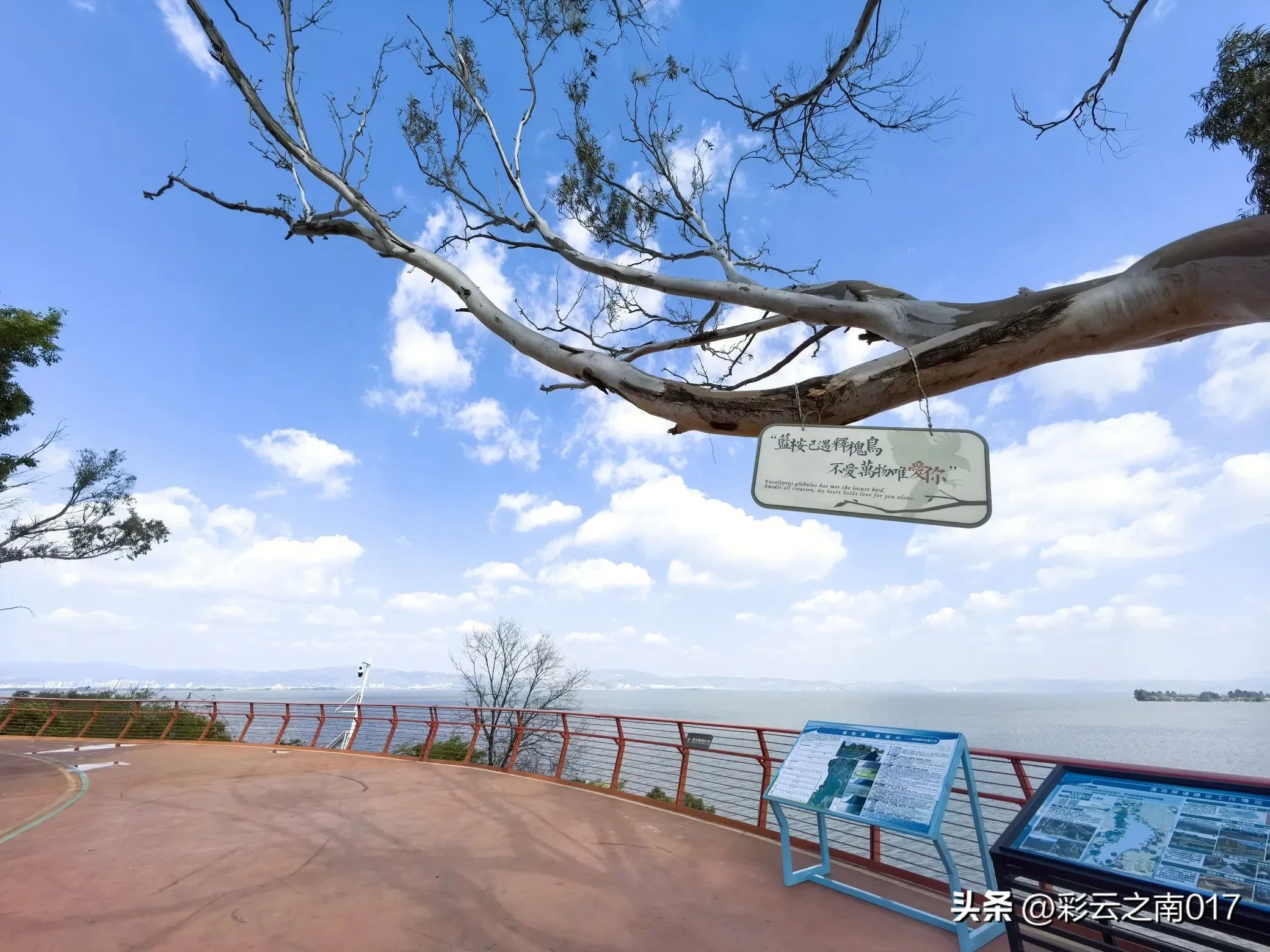 站在绿道高处远眺湖之桥,它宛如一条白色巨龙,横卧于山水之间,气势恢宏,蔚为壮观。蓝天白云之下,滇池水面波光粼粼,碧波荡漾,令人心旷神怡,仿佛所有烦恼都随之烟消云散。