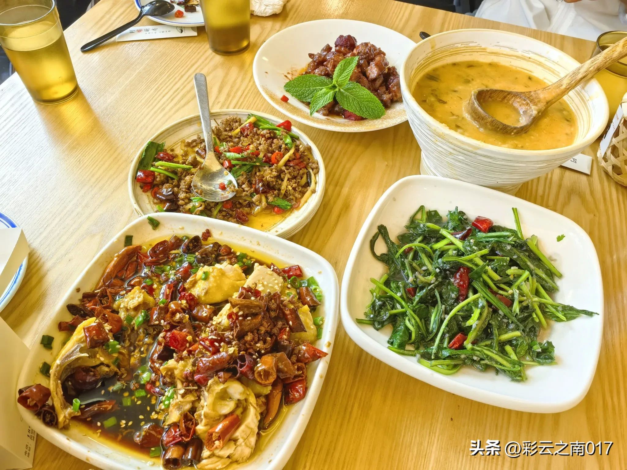 从湖之桥到昆阳很近,车程不过二十分钟。中午,我们在昆阳的“阿孃厨房云南创意菜”用餐。这家店在小红书上很多人推荐,果然名不虚传。上菜速度很快,菜品也很有创意,如芒果炒牛肉、红糖豆花、杨梅排骨等佳肴,每一道都精准捕捉了云南人的味蕾,让人回味无穷。