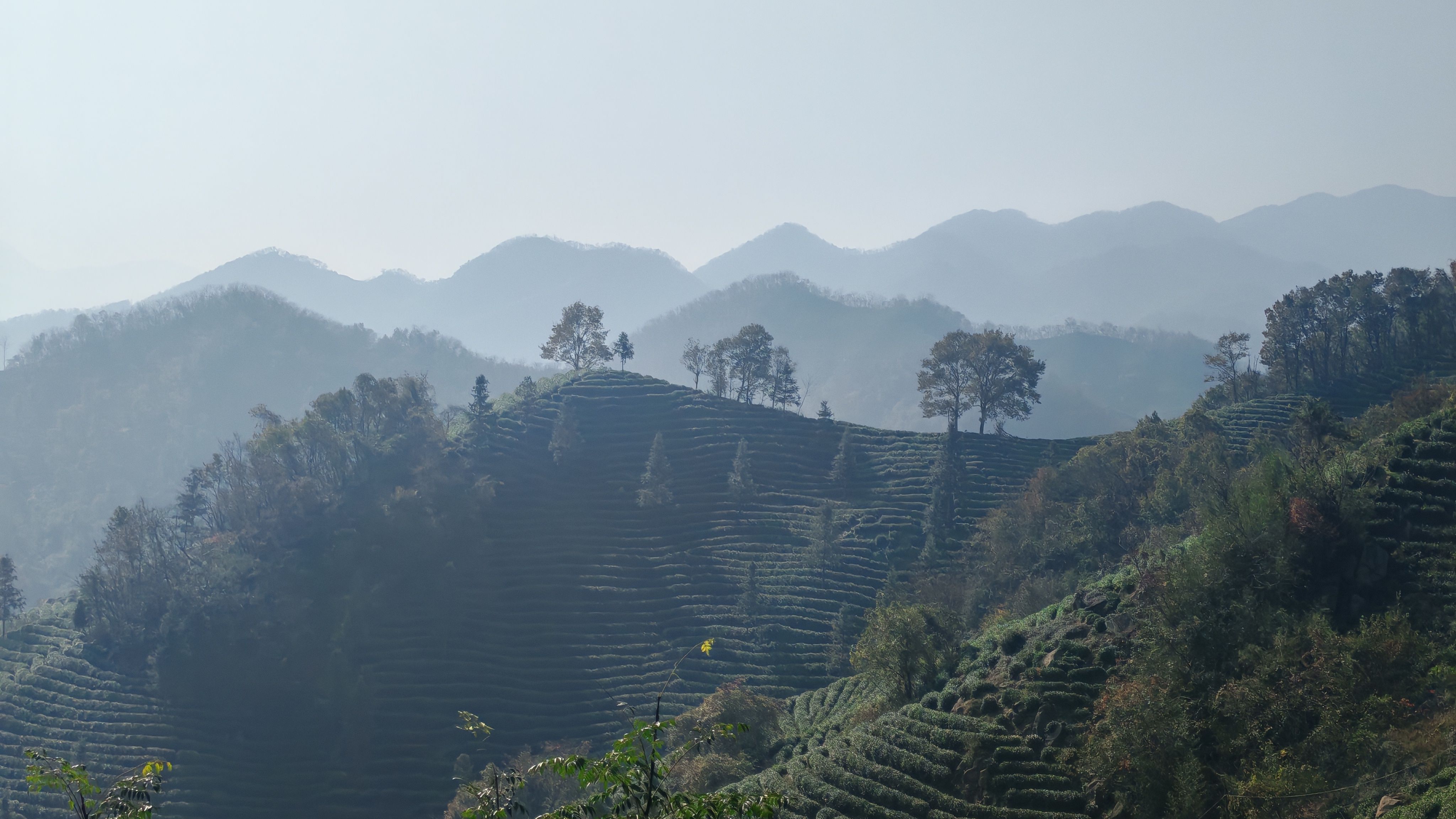 秋岚氤氲漫四望,为群山披上了一层柔和的滤镜。秋日的阳光醇厚柔润,将茶垄切割成明暗交错的琴键。