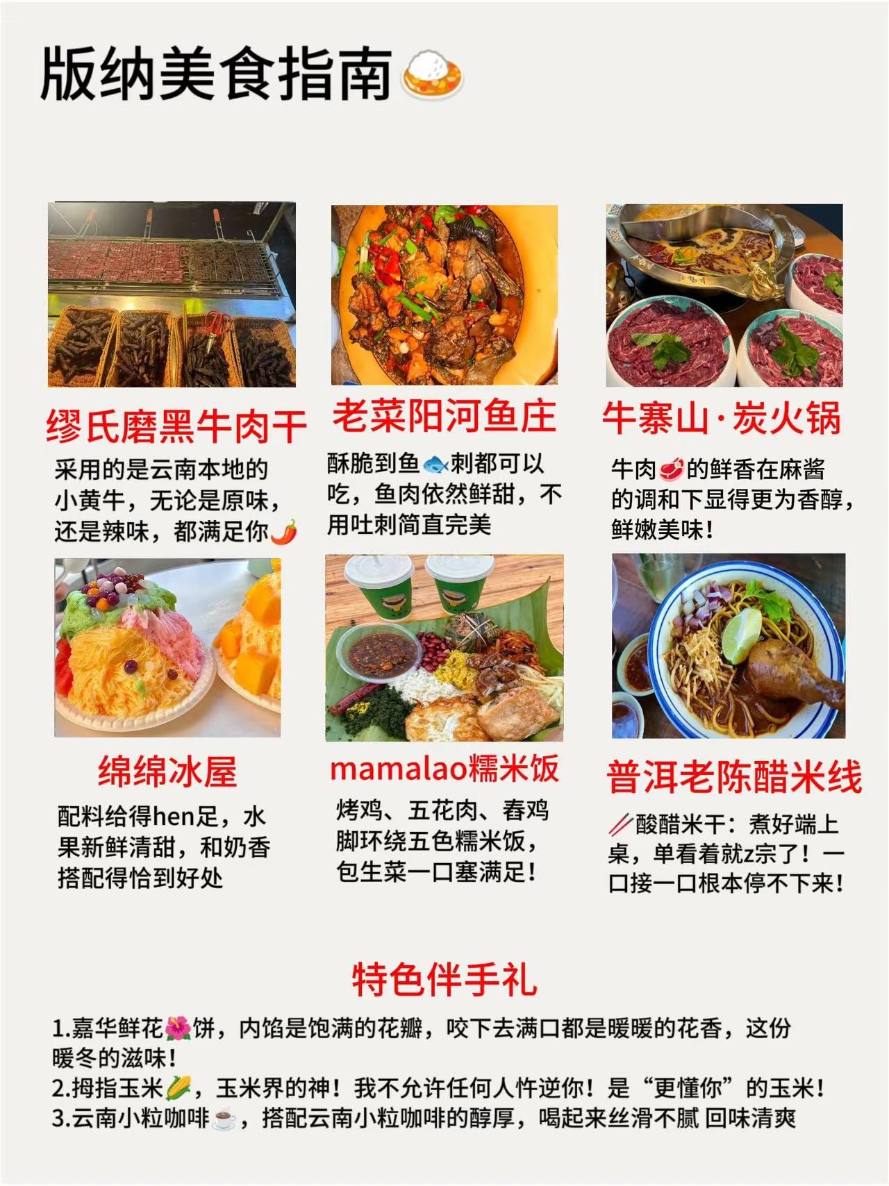 西双版纳超全旅游攻略!!建议直接照抄。秋冬准备来西双版纳旅游的朋友,本地土著为你们整理了一份游玩攻略,不踩雷!不绕路!!广希望大家都能在西双版纳这座小城 吃好喝好玩好~经典路线DAY1曼听公园总佛寺热带花卉园勐泐大佛寺告庄西双景DAY2中科植物园曼远村傣族园六国水上市场星光夜市DAY3原始森林公园野象谷基诺山寨般若寺江边夜市版纳Bi吃list️北榄坡·澜湄餐厅:可以俯瞰湄公河,灯光亮起时还能欣赏到对岸的夜景,主打泰式料理!泰式菠萝炒饭:融合了菠萝的果香、青椒的清辣、葡萄干的甜味等多种味道,入口清爽酸甜!️缪氏磨黑牛肉干:采用的是云南本地的小黄牛,无论是原味,还是辣味,都能满足你口味️菜阳河鱼庄:酥脆到鱼刺都可以吃,鱼肉依然鲜甜,不用吐刺简直完美️mamalao糯米饭:烤鸡、五花肉、舂鸡脚环绕五色糯米饭,包生菜一口塞满足!️普洱老陈醋米线:酸醋米干:煮好端上桌,单看着就z宗了!一口接一口根本停不下来!️绵绵冰屋:配料给得hen足,水果新鲜清甜,和奶香搭配得恰到好处️牛寨山·炭火锅:牛肉的鲜香在麻酱的调和下显得更为香醇,鲜嫩美味!特色伴手礼拇指玉米,嘉华鲜花饼,云南小粒咖啡#西双版纳旅行 #西双版纳美食#北榄坡澜湄餐厅 #东南亚美食#告庄星光夜市