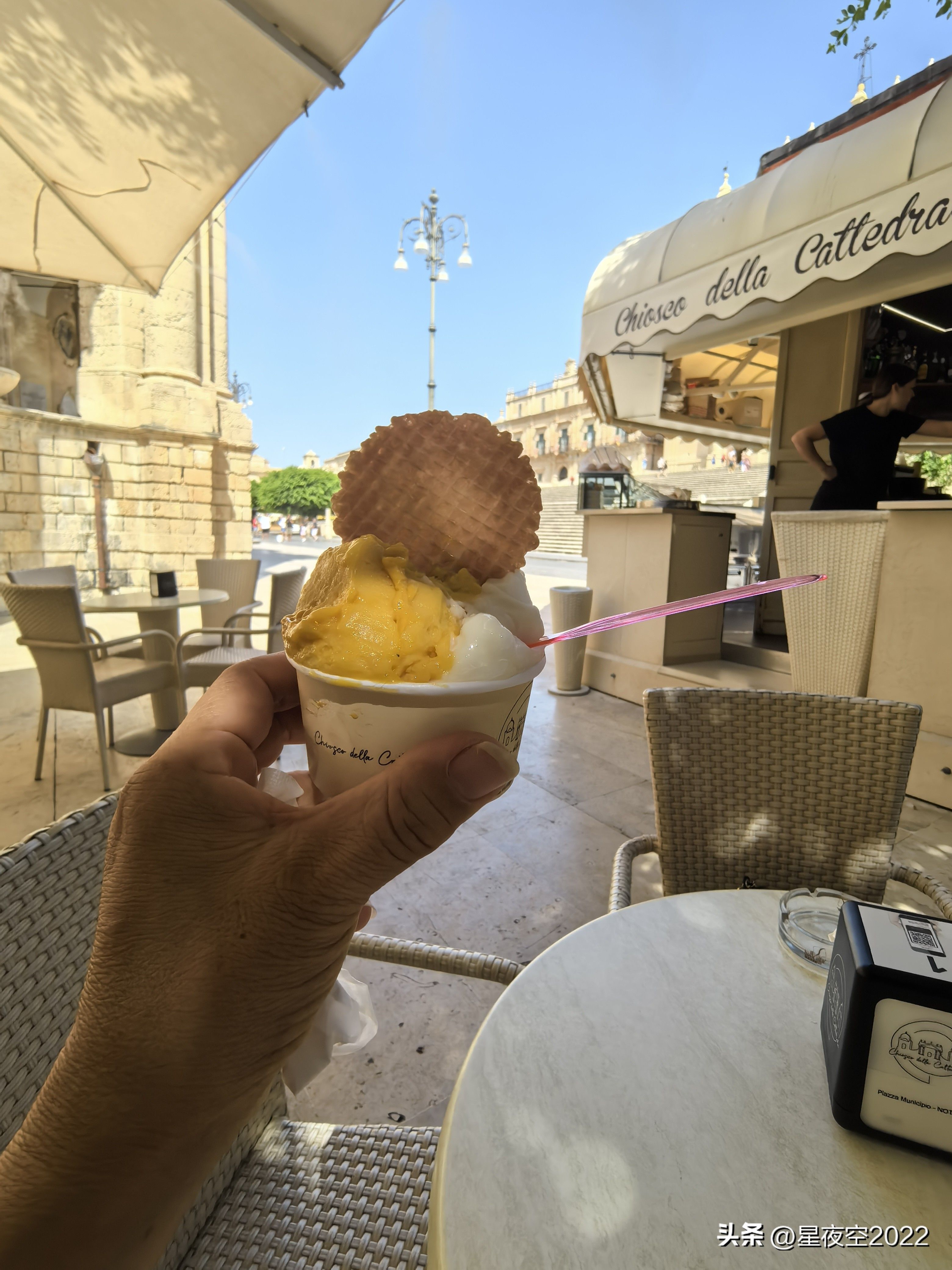 从北京出来已经9天了,对意大利教堂、神庙、剧场也不像刚来时那么兴奋了,旅行进入了上车睡觉、下车拍照状态,特别是今天阳光分外耀眼,除了坐在遮阳伞下吃冰激凌,其它的都失去了兴趣,我恋上了意大利的冰激凌[笑哭],见图1。