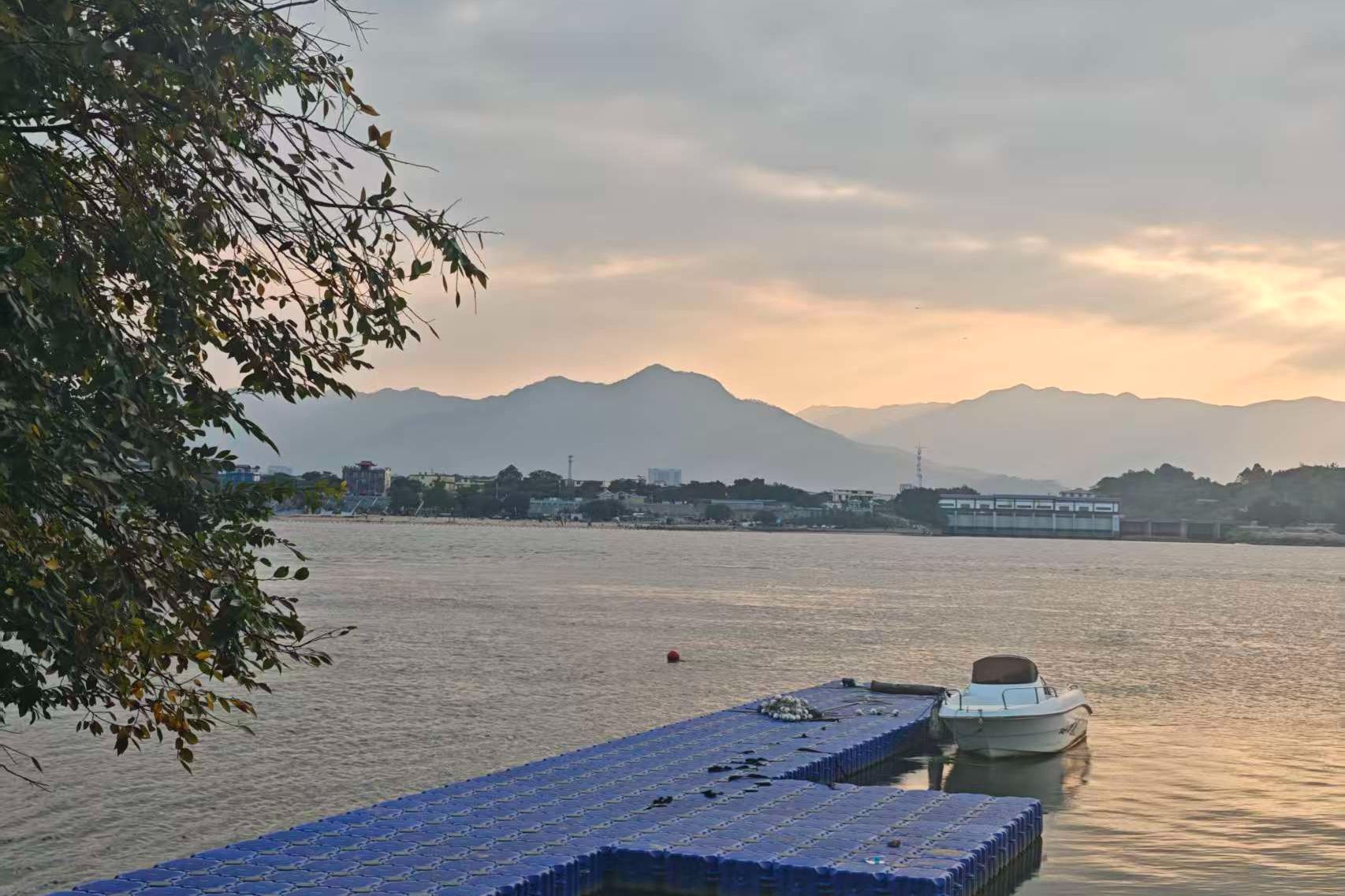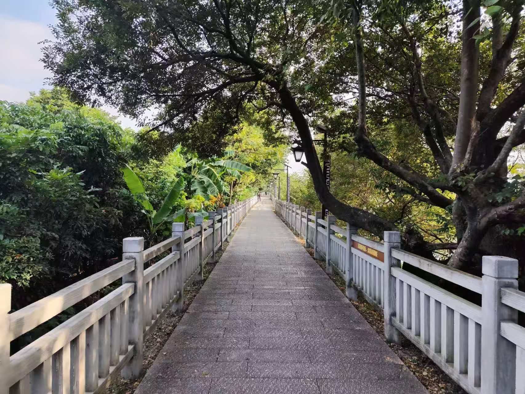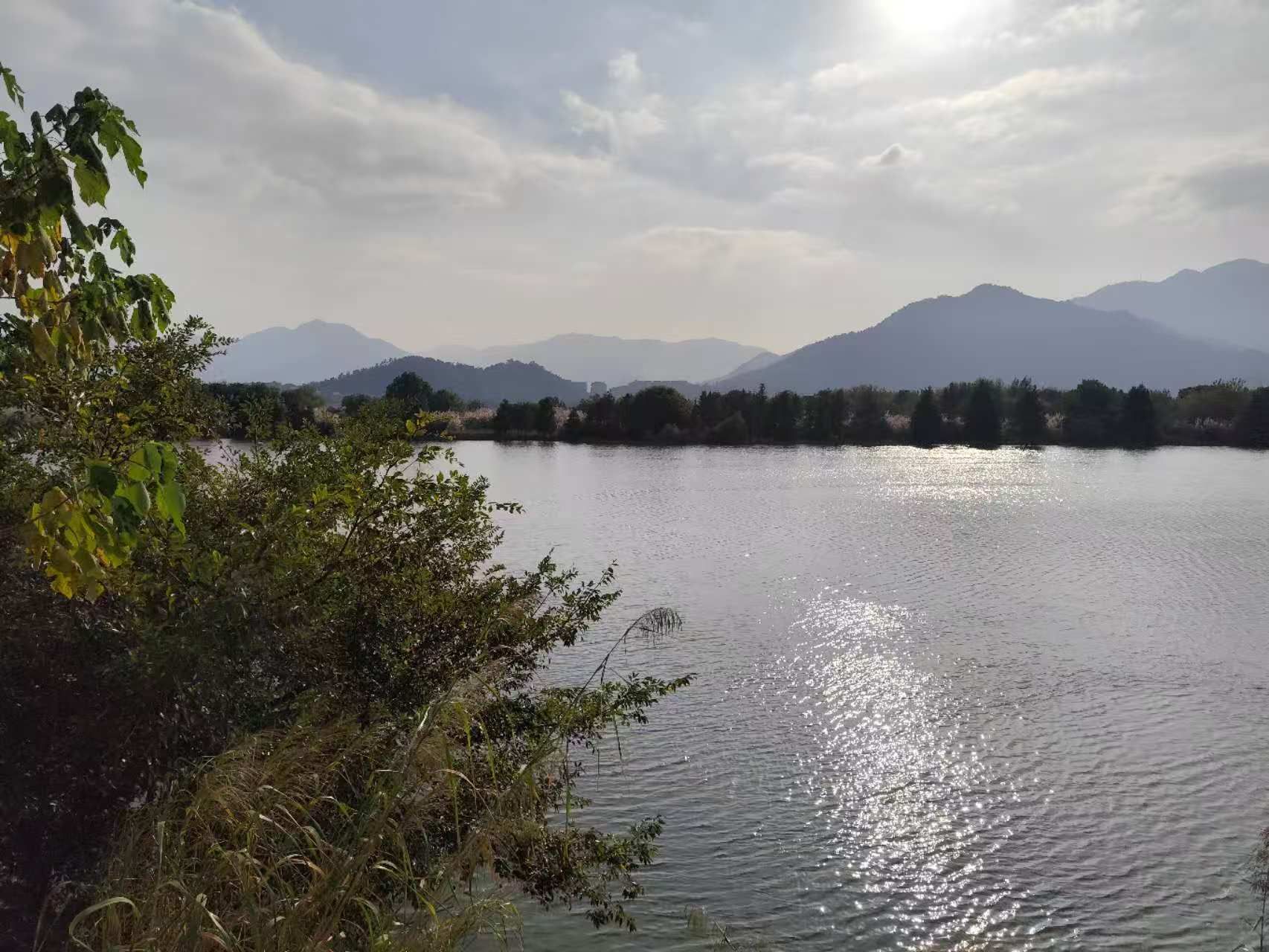 此行最大的收获在涤心路上,这是一条石头垒出的江堤,堤下的绿植已经密布,有龙眼、橄榄也有香蕉、木瓜,最奇异的是岸边的芦苇,花开粉色,远看过去,像一丛丛的粉黛子草。江堤上再看对岸的青山,美极了!夕阳下的山分青色、绿色、深绿色。阳光刺破云层,洒在山梁上,如万箭齐发般地壮观。