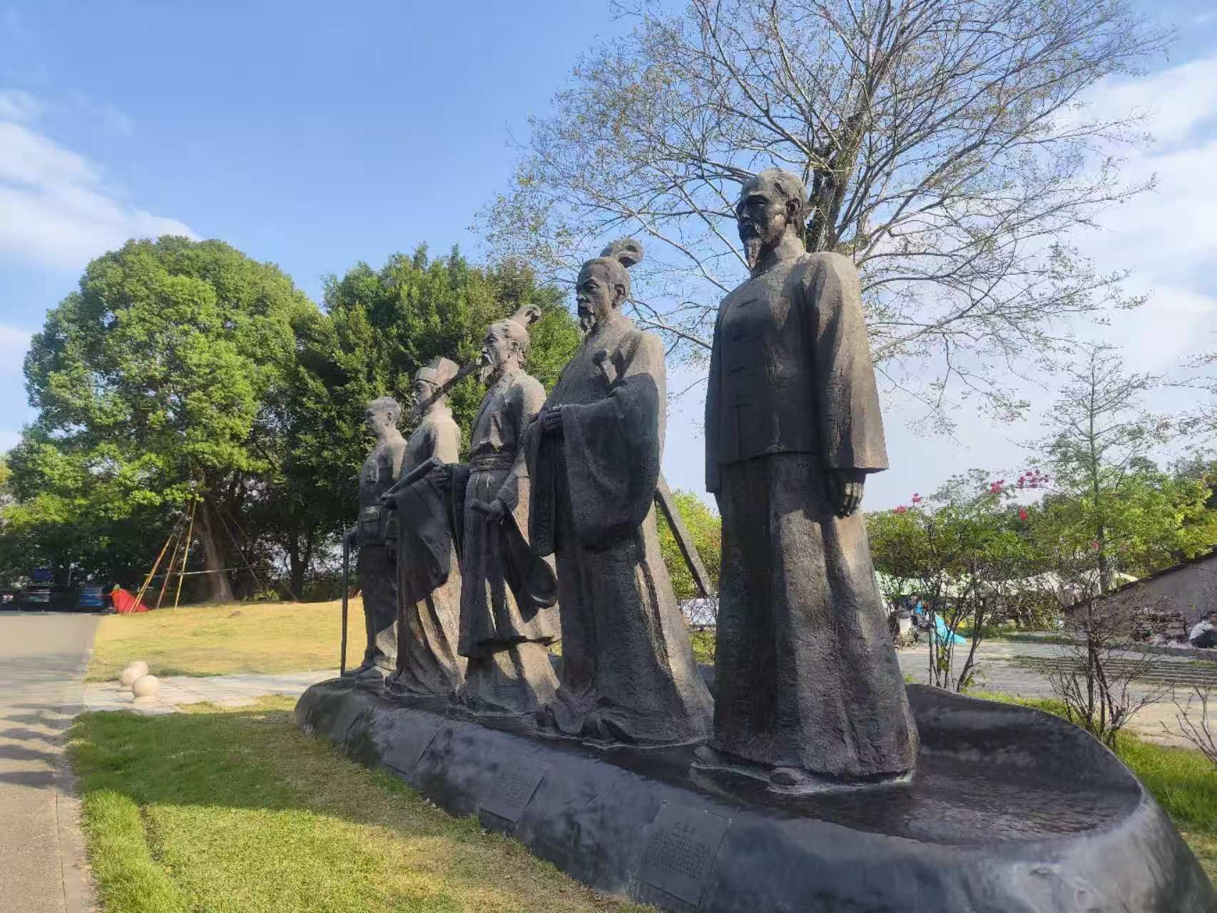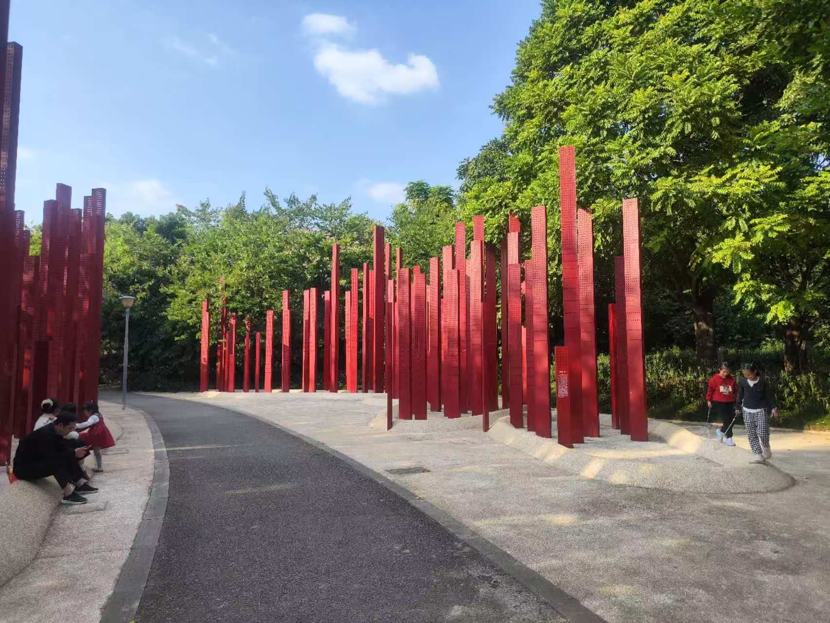 法治廉政公园入口有二,我们去的是离福州近的入口。园内车位紧张,因为这个园子已经成为网红公园了。赏秋是公园的最大福利,只是我们去得早,园中落羽水杉还没变色。我们初到此园,园子中央雕塑着五尊法治先驱的铜像,分别是董必武、王安石、管仲、李悝和沈家本。除最后一人不认识外,其他四人我都认识,但也没有参透他们之间的内在联系。继续前行,来到一处广场,广场遍立红色的扁柱,喻意不明,我想该不会隐喻判案上签筒中的签子吧,那一签子下去,马上有捕快上前执行命令——这彰显法律的威严的意思么?