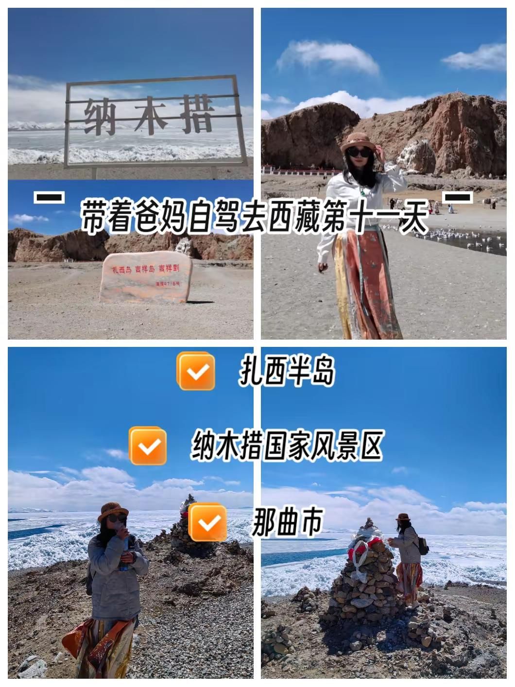带着爸妈自驾去西藏第十一天。拉萨纳木措那曲 367公里精华攻略 行程概览日期:2024年4月19日(春季)路线:拉萨 纳木措 那曲里程:约367公里驾驶时长:约5小时(不含游玩时间)重点景点:纳木措、念青唐古拉山脉、扎西半岛、那曲市区海拔变化:拉萨(3650米) 纳木措(4718米) 那曲(4510米) 上午:拉萨出发,奔赴“天湖”纳木措清晨从拉萨酒店出发,建议7:00前启程,避开早高峰车流,也为高原行程预留充足时间。沿G109青藏公路一路向北,途经羊八井地热谷,远处雪山若隐若现,空气逐渐清冽。 沿途亮点:念青唐古拉山脉行驶约2小时后,进入当雄县境内,念青唐古拉山脉逐渐清晰。天气晴好时,可远眺海拔7162米的念青唐古拉主峰,雪峰巍峨,气势磅礴。途中经过海拔5150米的那根拉山口,是俯瞰纳木措全景的最佳观景点之一。 注意:此处风大温低,下车务必穿厚、动作缓慢!轻微弯腰或快走都可能引发高原反应,建议随车备好氧气瓶,出现头晕、呼吸急促立即返回车内吸氧休息。 中午:抵达纳木措,邂逅“地球的眼泪”穿过那根拉山口,纳木措如一面巨大的蓝宝石镶嵌在天地之间,豁然出现在眼前。 门票与交通景区门票:旺季180元/人(淡季可能免费或半价,建议提前查询)自驾可驶入景区至集散中心,但前往扎西半岛必须换乘景区环保车(票价约30元/人,往返) 扎西半岛游玩亮点鲜活的蓝:初见纳木措是明亮通透的亮蓝色,阳光洒在湖面,泛着冰晶般的光泽;深入湖心后,湖水转为深邃幽蓝,静谧而震撼。与海鸥互动:湖边成群的棕头鸥不怕人,可带些小饼干或糌粑喂食,它们会轻盈地落在你手心,是亲子游的温馨时刻。地标打卡:合掌石、迎宾石、玛尼堆、经幡阵都是必拍点,尤其是合掌石,象征念青唐古拉与纳木措的爱情传说。 高原提示:海拔近4720米,带上氧气瓶,随时呼吸,避免奔跑、大声喧哗,拍照打卡后尽快返回车上休息。建议游玩时间:1.5~2小时,不宜久留。 下午:离开纳木措,驶向那曲 行程安排从纳木措景区返回至当雄县(约80公里,1小时车程)在当雄稍作休整,可简单用餐(推荐藏面、酥油茶、牦牛肉包子)沿G6京藏高速一路向北,直达那曲市区(约170公里,2小时车程)全程高速,路况良好,沿途可见辽阔草原、成群牦牛、翻滚云海 傍晚:抵达那曲,感受藏北“北大门” 那曲印象位于唐古拉山与念青唐古拉山之间,地处羌塘草原南缘平均海拔4500米以上,气候干燥寒冷,昼夜温差大是西藏的“北大门”,青藏铁路、公路贯穿全境,交通便利 住宿推荐选择带弥散式供氧的酒店,缓解高反不适房间尽量选择低楼层,避免电梯频繁升降加重高反 旅行贴士:高原自驾必备清单 物资准备氧气瓶(至少每人2瓶)保暖衣物:冲锋衣、羽绒服、帽子、手套(4月湖边风大如寒冬)高热量食物:巧克力、牛肉干、能量棒防晒三件套:墨镜、防晒霜(SPF50+)、遮阳帽 驾驶提醒青藏公路车流量大,注意避让大货车 那根拉山口、纳木措路段多为盘山路,谨慎驾驶景区环保车换乘点有停车场,注意锁好车门 结语这一天,你将穿越雪域圣境,从拉萨的信仰之城,驶向纳木措的纯净之眼,最终抵达那曲的辽阔苍茫。这不仅是一次地理的跨越,更是一场心灵的洗礼。在海拔近五千米的蓝天下,看云卷云舒,听风过经幡,你会明白——西藏,值得用一生去读懂。温馨提示:春季纳木措仍有积雪,湖面可能未完全解冻,别有一番冰湖韵味。但天气多变,出发前务必查看当雄与纳木措实时天气与路况,确保安全出行。#带着老爸老妈自驾去西藏 #寻味人间烟火 #川藏旅行 #看世界