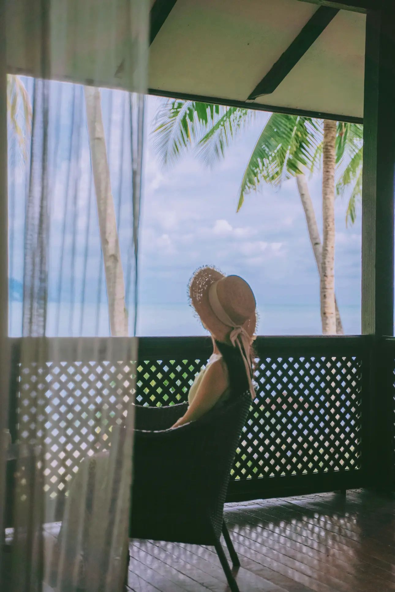 ·酒店都是一栋一栋的木屋,每栋木屋有两层,分海景和园景。我们入住的是海景房,拉开窗帘就可以看到椰林大海。