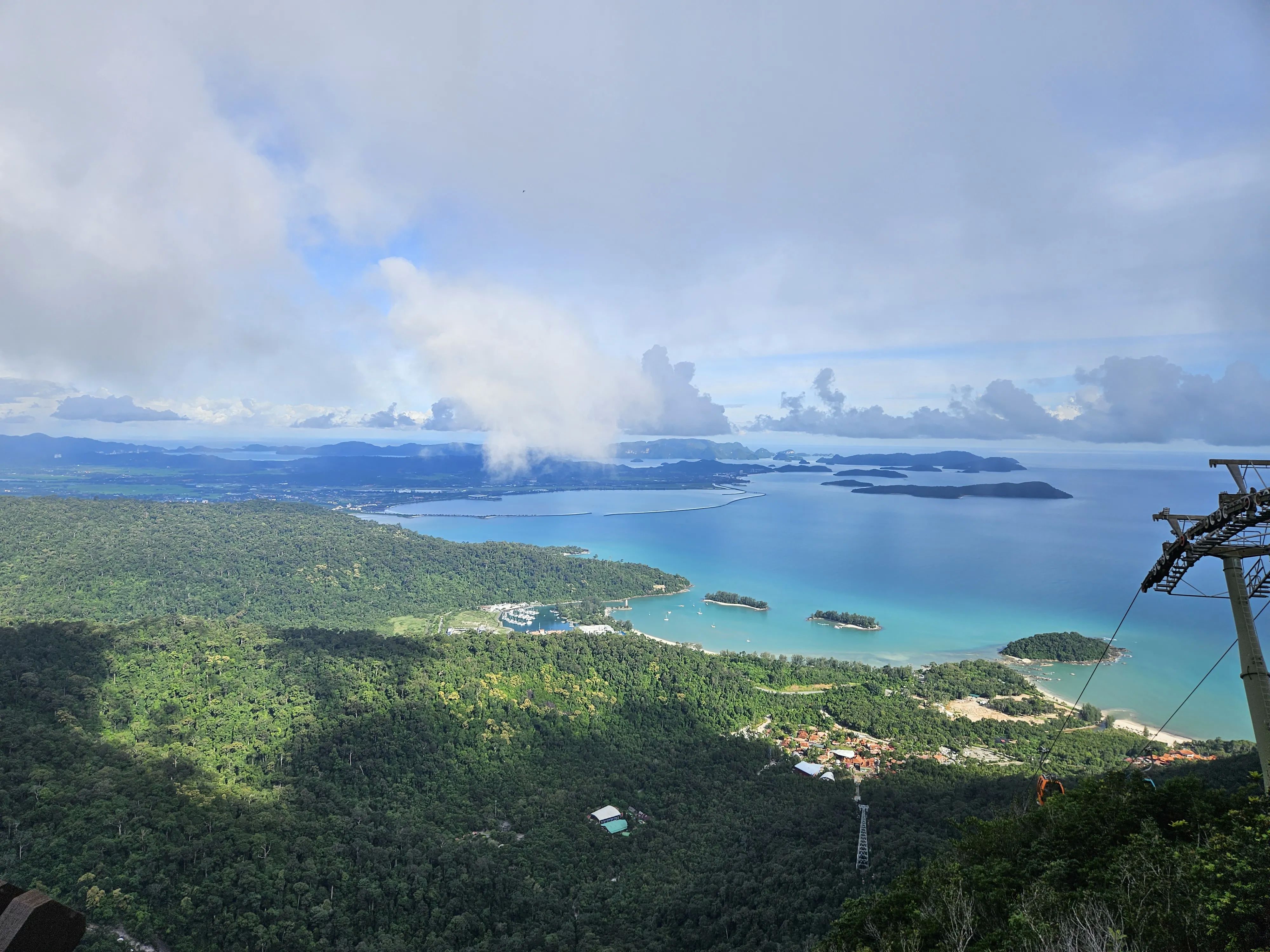 午餐结束,驱车去民宿,5分钟就到了。门口密码箱拿了钥匙,开门自行入住。这是套3房2厅2卫的公寓,基本设施都有,卫生状况也很好,600元一晚上,觉得性价比不错。由于昨天的红眼航班,都没休息好,所以下午我们都睡了一觉。3点多,我们出发去了兰卡威第一个景点,“天空之桥”。景点门票是80马币,含来回缆车费用。缆车15分钟后到第一观景点,可以俯瞰整个兰卡威的碧海蓝天。旁边就是“天空之桥”,看起来还是挺震撼的,整个桥体横跨两座山峰,就靠一根钢梁支撑起6条钢索,力学方面用到极致。对于我们造桥大国来说,这技术难度不大。但放在上世纪90年代的时候,能建成该桥,可见马来西亚当时的科技水平还是比较领先的!