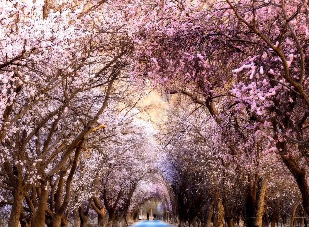 3月中下旬,南疆的杏花率先苏醒。大同乡的百年杏树在帕米尔高原绽放,粉白花朵与远处的雪山、苍茫戈壁形成强烈反差。塔吉克族村落散落其间,牧民赶着羊群穿行花下,原始而野性的美震撼人心。