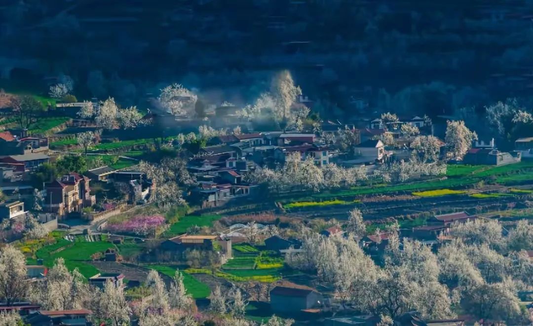 阿坝州的金川被称为“雪梨之乡”,3月中旬,万亩梨花沿河谷盛放,如雪花般覆盖山野。神仙包的山丘上,碉楼与梨花相映成趣;喀尔乡的梨花大道蜿蜒如带,风吹过时,花瓣纷飞如雪,藏寨的烟火气更添一份淳朴。