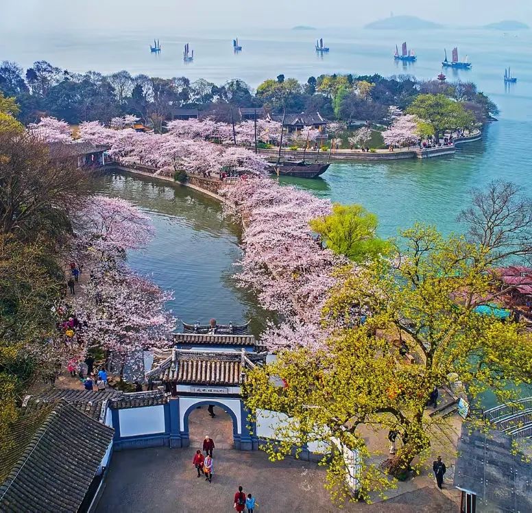 作为“世界三大赏樱胜地”之一,鼋头渚的樱花在3月中旬迎来盛放期。3万多株樱花树沿太湖铺展,粉白的花瓣如云似雪,倒映在湖面上,形成一片烂漫的“樱花海”。登上长春桥,或是泛舟湖中,都能感受到“人在画中游”的诗意。